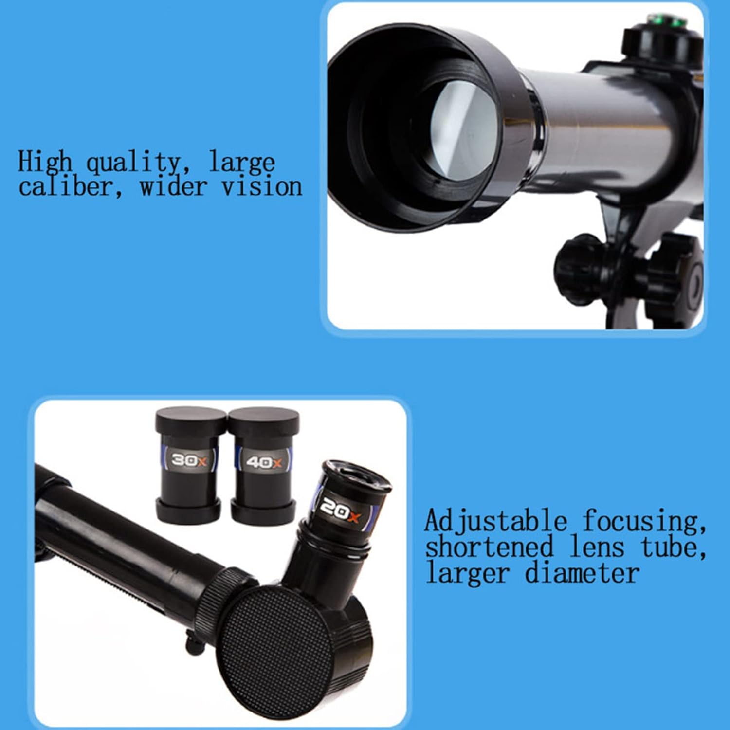 Telescope for Adults & Kids, Portable Travel Telescope, Refractor Telescopes for Astronomy Beginners, Astronomy Gift for Kids to Explore Moon and Planets The description: *Prism-type zenith mirror, the working principle is to use the principle of total reflection of light, and the surface precision of the prism is higher. *Fixed tripod design, using ergonomic principles to make the telescope stable, the connection can also be rotated 360 °, you can rotate where you want to see. *High quality, large aperture, wider field of view, and better fiber optics. This astronomical telescope is a great choice for all enthusiasts, and it brings great interest to children. *Humanized design, adjustable focus, shorter lens barrel, larger diameter, making observation more convenient and easier to get started. *A compass is attached to the telescope to facilitate the observation of the starry sky in which direction. *The telescope adopts a 340° vertical surround, which is more convenient for children to observe objects from different angles. Specification: Product Name:Astronomical Telescope Packing size: 43.5*22*8cm Product weight: 0.50kg Material composition: plastic and hardware Applicable age: 8 years old and above Accessories: 1*Astronomical Telescope 2*Eyepiece (30X, 40X) 1*Tripod