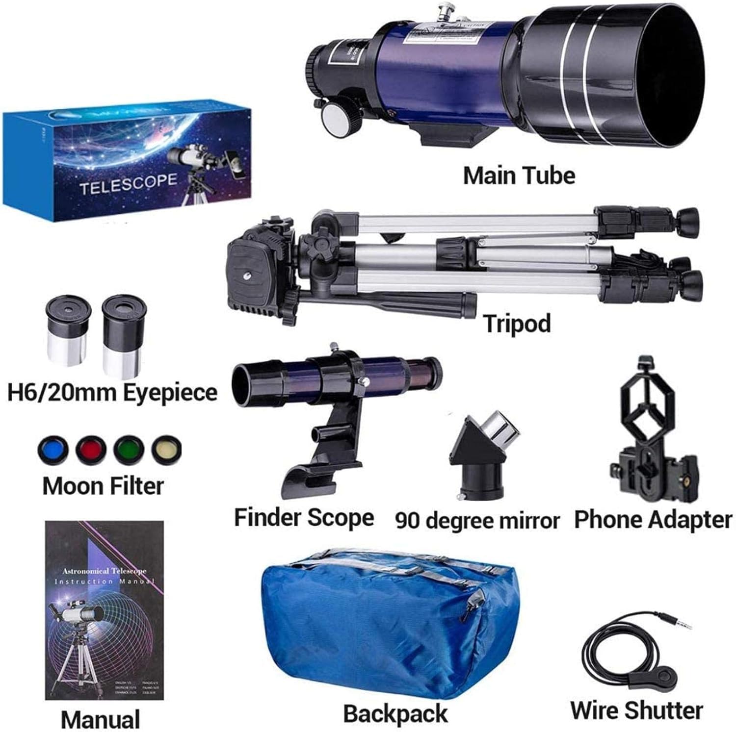 70MM large aperture adopts advanced optical lens group, high-quality optical glass multilayer broadband coating, so that the light transmittance can reach 98.9%, and the image is clear and sharp> Specification> Optical : Refractor> Aperture: 70mm(2.75in)> Finderscope: 5*24> Focal Length: 400mm(15.75in)> Eyepiece: K6mm, K25mm> Mirrors: 45erect-image diagonal> Item size: 435*160*110mm> List:> 1*smart phone adapter> 1*camera shutter wire control> 1*adjustable tripod> 4*moon filters> 2* eyepieces> 1*user manual> 1*backpack> Steps for usage:> 1. step> Aim at the subject to be observed, adjust the appropriate height and> 2. step> The finder mirror is coaxial and parallel to the main lens barrel. Look at the finder mirror and adjust the up, down, left, and right angles through the tripod handle to find the position of the observation object> 3. step> Lock the observation object, watch the eyepiece of the main tube, and adjust the focus wheel to clear> Reminder: Please wear a Bard film when observing the sun. Do not observe the sun directly, so as not to{/p}