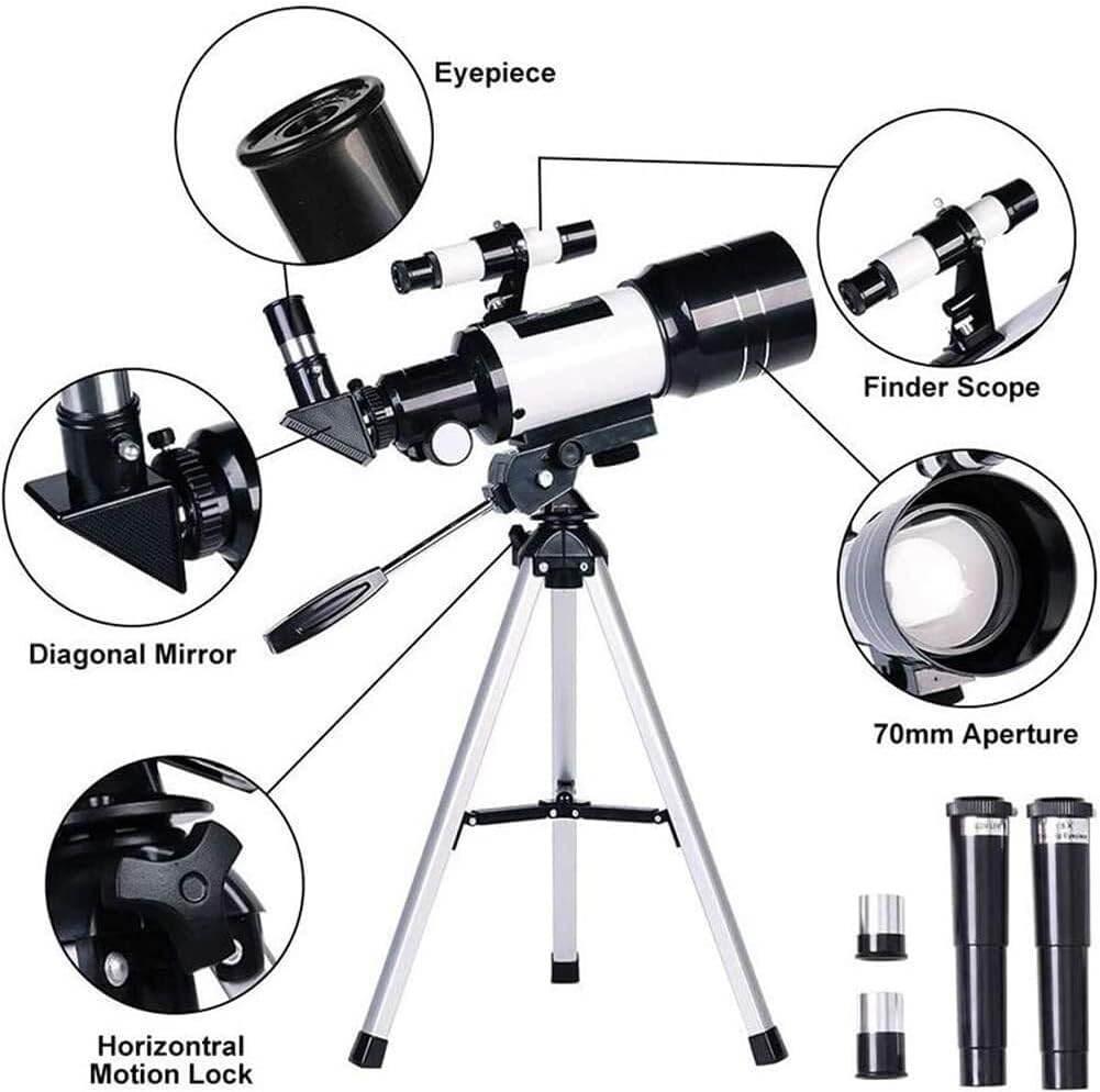Explore the wonders of the universe with the 70mm Aperture 700mm Focal Length Refractor Telescope, designed for beginners, kids, and adults. This high-performance telescope is perfect for stargazing, observing the moon, planets, and even distant terrestrial landscapes.Featuring a 70mm aperture and 700mm focal length, this telescope delivers clear and bright images with 70X and 35X magnification using the included 10mm and 20mm eyepieces. The advanced optics, with fully multi-coated glass lenses, effectively reduce chromatic aberration and improve light transmission, offering vivid, crisp views of celestial bodies.The included smartphone adapter with 5X lens allows you to capture stunning images and videos of the night sky, making it easy to share your discoveries with others. The full-size stainless steel tripod is fully adjustable, offering stability and flexibility in any viewing position, ensuring a steady, enjoyable viewing experience.The equatorial mount features two slow-motion control cables, giving you precise control to track objects as they move across the sky, perfect for both casual stargazing and more serious astronomical observations.Designed for easy no-tool setup, this telescope is quick and simple to assemble, making it the ideal choice for beginners, families, or anyone new to astronomy. Whether you're gazing at distant planets or exploring the landscape during the day, this telescope is an excellent tool for both astronomical and terrestrial viewing.This beginner-friendly telescope is the perfect gift for kids, adults, and aspiring astronomers, sparking curiosity and enhancing their understanding of the universe while fostering a love of science and discovery.