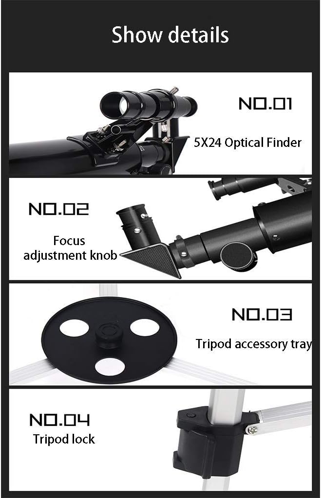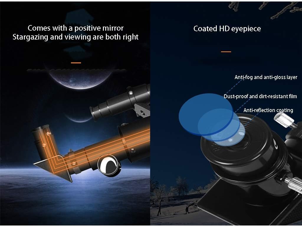 1. The refractor has a strong focal length, a large field of view, and a strong resolution.Multilayer optical coating,Refractive optical system,high light transmittance, and enhanced image brightness and clarity.Aluminum tripod > 2. It is very suitable for astrometric work, and it performs well in observing the moon, planets, and binary stars. Easy to observe the ground view, very suitable for enlarged photography of the moon and planets> 3. The telescope is suitable for beginners or . It is easy to install and observe for beginners. It will encourage to like learning space, get close to nature and stay away from electronic products. And provide a wonderful holiday or birthday gift idea for who like science and astronomy. > 4. The telescope provides our customers with a 24-month . If you have any questions about quality after receiving this space telescope, please contact us for the . We provide a high standard of 24/1725 customer service, and will do our best to solve it for you until you are satisfied.{/p}
