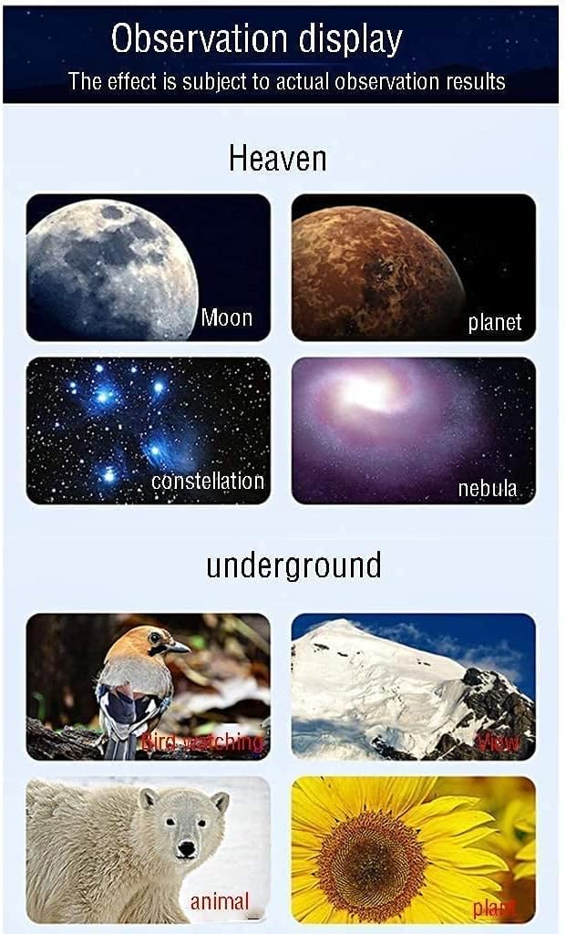Start your journey of discovery! Here's a versatile telescope designed to pack up and go anywhere. It's excellent for daytime birding,nature study and scenic viewing,and will take you beyond the Earth's horizon for nighttime stargazing and Moon-watching.The best Christmas and holiday gifts for children! Product specifications Optical system: refraction Magnification: 336 times Caliber: 50-100mm Focus ratio: 5.76 Bracket: Theodolite Package Included: 1 telescope only Tip: We only sell telescope ,not including other decorations. Due to problems with light,display,etc.,the color difference of the product is normal. If you have any questions about the product,please leave us a message and we will get back to you within 24 hours. Note: This product is an amateur beginners telescope. If you need a special telescope for professional work,please purchase it carefully.