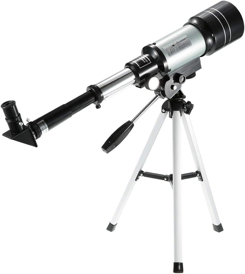 Specifications:Material: Aluminum alloyAperture: 70mmFocal Length: 300mmMax Magnification: 150XHybrid Diagonal: 90°Eyepiece: H6mm, H20mmTripod Height: Max. 38cm / 15inPackage Size: 46 * 22 * 11cm / 18.1 * 8.7 * 4.3inPackage Weight: 1596g / 3.5lbPackage List:1 * Telescope Main Tube1 * H6mm Eyepiece1 * H20mm Eyepiece1 * 3X Barlow Lens1 * 1.5X Erecting Eyepiece1 * Tripod1 * Adjustable Lever1 * Moon Lens1 * User Manual (English & Fch)Entry-level refractive astronomical telescope with 70mm aperture and 300mm focal length, great for students or those who are interested in learning more about the space and night skys. With 3X barlow lens, this maximum magnification of this telescope can reach 150 times, which can increase the viewing capability. Lightweight and portable, this telescope can be a wonderful gift for those who love observing animals, enjoying scenery, traveling, etc.