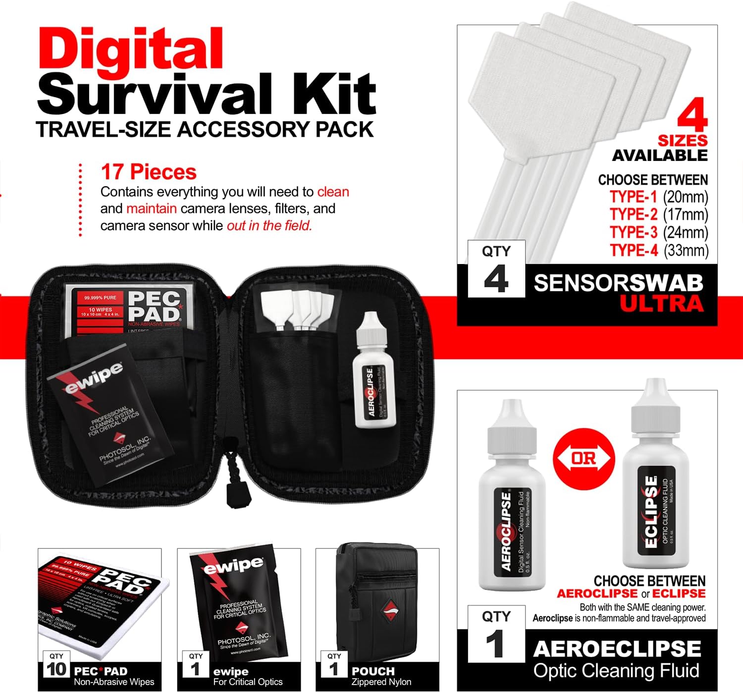 | BuiltIn Media | 1/2 oz bottle of Aeroclipse Optic Cleaner, 10 sheets of PEC PAD Photo Wipes, 1x E-Wipe packet for cleaning lenses, 1x Zippered nylon pouch for storage, 4x Type-4 (33mm) Sensor Swabs |