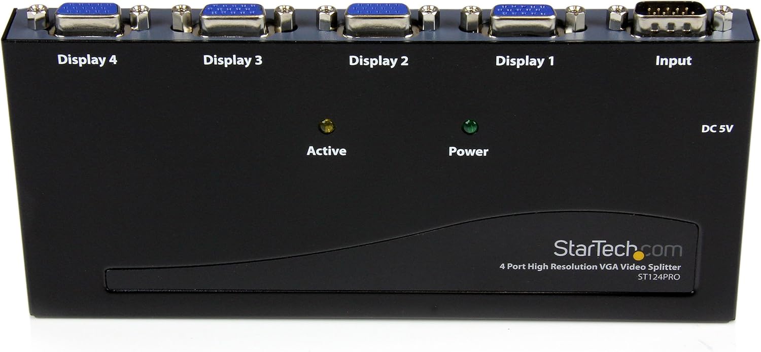 The ST124PRO 4 Port High Resolution VGA Video Splitter - 350 MHz splits a VGA video source signal to 4 monitors or projectors simultaneously - a professional grade solution that is perfect for presentations, classrooms, tradeshows, or in-store displays, where the highest quality video on several monitors is needed. This High Resolution VGA Splitter supports monitors with up to 350MHz of video bandwidth and display resolutions up to 2048x1536 @80Hz. For added versatility, the VGA splitter features an integrated booster circuit that allows the video signal to be extended up to 210 feet (65 meters), enabling you to situate your displays in the most convenient location based on your application. This product is TAA compliant and backed by a Startech.com 2-year warranty with free lifetime technical support. Male to Female VGA extension cable required (MXT101HQ)
