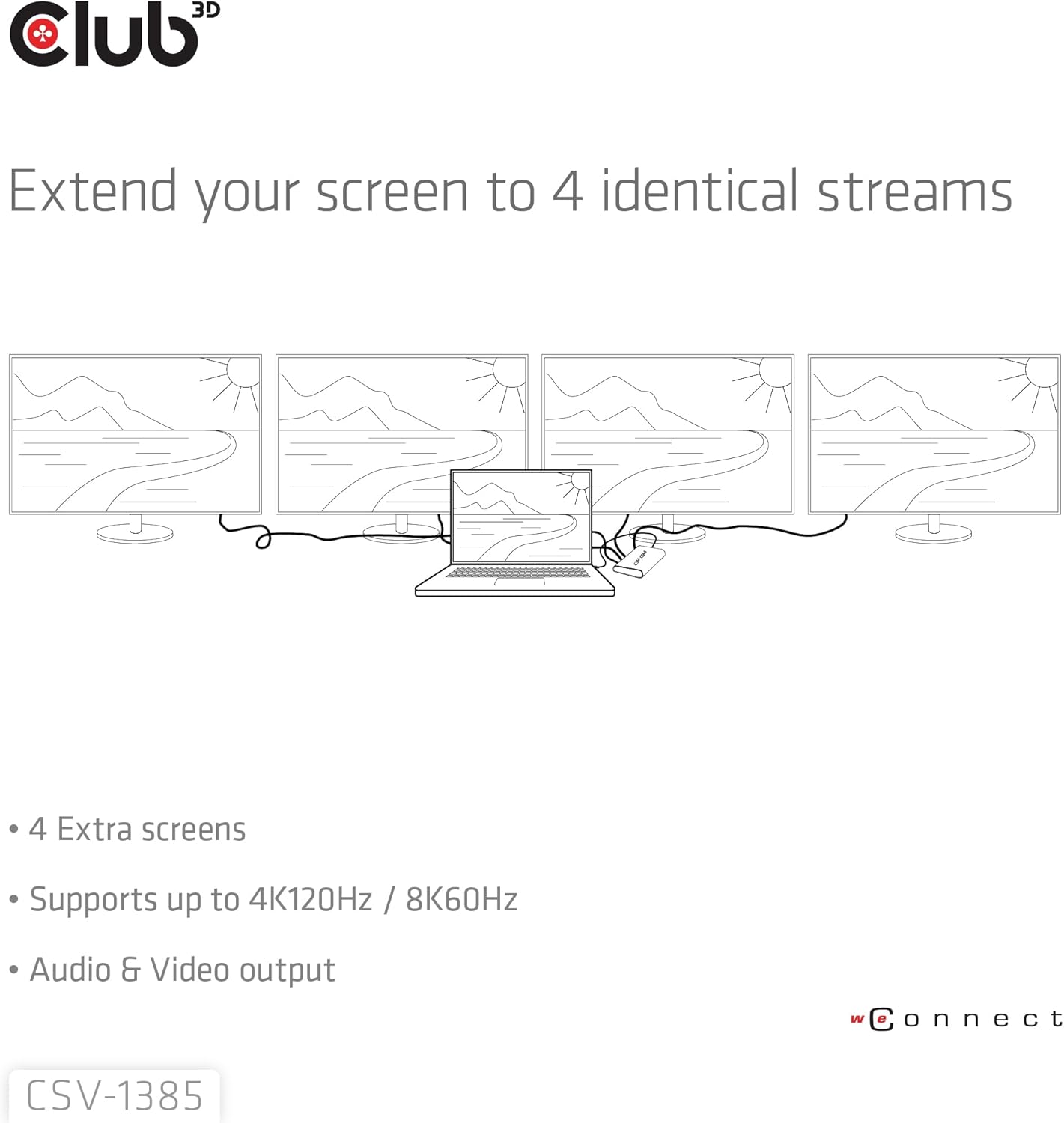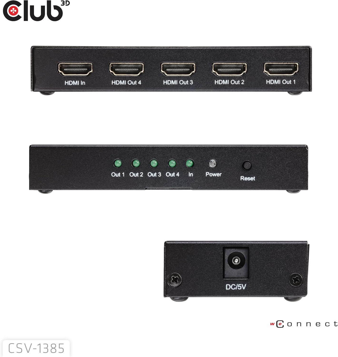 The Club 3D CSV-1385 is a powerful and compact 1 to 4 HDMI™ 4K120Hz splitter with hot plug and metal housing. Splits HDMI™ signal input to four identical outputs at the same time. Delivers high-performance audio and video output via HDMI™ cables with resolution up to 4K@120Hz. This splitter only divides the input signal to 4 outputs, according to the specifications of the input signals. This is a powerful small HDMI™ splitter in a metal housing with an external power supply of 100-240VAC / 5V-2A DC. It is an ideal helper at home and at work.