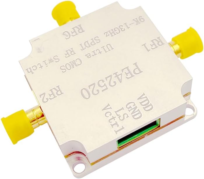 JMT PE42520 13GHz RF Module SPDT Switch X-Band Switching 10Port with SMA Female Connector 35*35mm Parameters: 1. Power supply: 5V(10mA). RF port: SMA female connector. 2. Maximum input power: 26dBm 3. Size: 35*35mm, the structure adopts splint SMA,and the aluminum alloy is separated from the top and bottom Shielded enclosure. 4. Loss and isolation parameters, refer to the provided S parameters.
