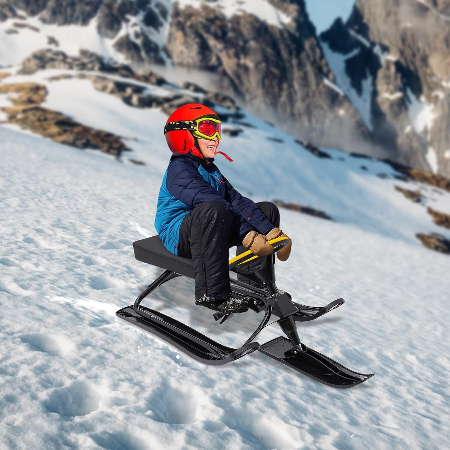 DescriptionIf you are also looking for a snow sled for your child, then our product will be a good choice for you. Its cool kart appearance, responsive brakes, excellent load-bearing capacity (220.05 lbs), high-quality materials, and exquisite craftsmanship ensure that it is an excellent sled worthy of your choice and trust! Take it with you and enjoy a pleasant skiing time with your child!DetailsFlexible Steering Wheel: It allows kids to easily change the direction, which enhances controllability and keeps them engaged in the skiing sport. Anti-slip Pedal: The multiple protrusions on it can effectively prevent slipping and ensure safety during skiing.Smooth Edges: They can better care of kids' skin during installation and use, thus improving the safety of use.ApplicationThis product is suitable for both adults and children and can be used for skiing, ice skating, sand skating, etc.SpecificationMaterial: Steel, Plastic, PE, PU Process: Welding, Spray CoatingLoad-bearing Capacity: 100kg/220.5lbSport Type: SkiingStyle: Modern Number of Pieces: 1Assembly Required: Yes Mount Type: Free Standing Suitable Kids Age: 3-15 Years Seat Length: 46cm/18inEach Baseboard Length: 79cm/31.1inOverall Size: 114*50*38cm/44.88*19.69*15inPackage Size: 88*44*17.5cm/34.65*17.32*6.89inGross Weight: 6.4kg/ 14.11 lbsNet Weight: 5.4kg/ 11.91 lbsPackage Included1* Snow Sled1* English Installation DiagramAll Accessories for AssemblyNotes1.Please purchase professional helmets, and knee and elbow protectors, and take proper exercise safety measures before use.2.Please allow the slight color difference caused by the shooting light and the 1-3 cm error due to manual measurement, and make sure you do not mind before ordering.