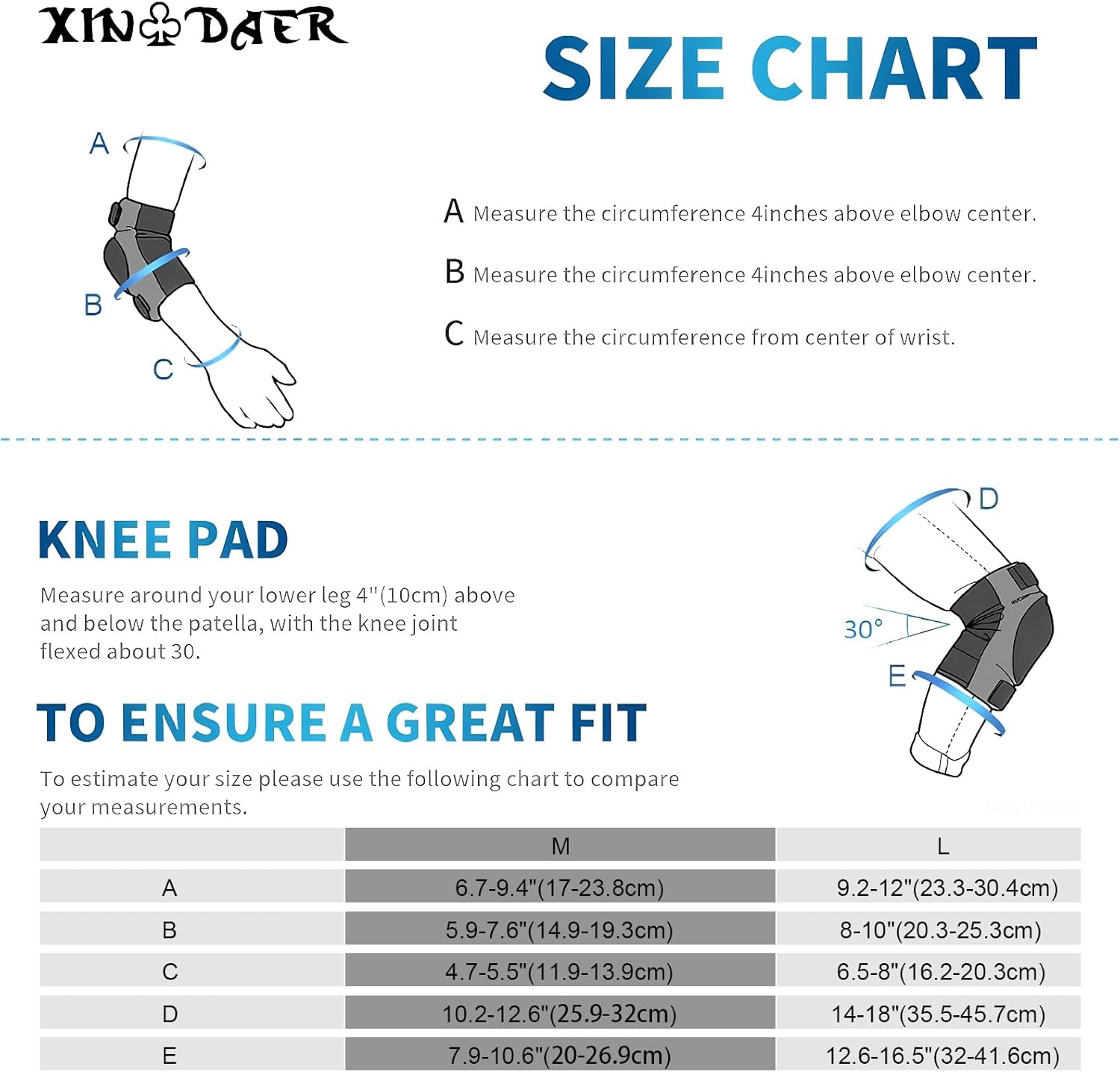 ★★★★★★★ XINDAER Skating Protective Gear Set Adult Knee and Elbow Pads ★★★★★★★➤ 1. XINDAER skating protective gear set includes 1 pair of elbow pads, 1 pair of knee pads and 1 pair of wrist guards. ➤ 2. The wrist guard and knee pads use thickened EVA and PE materials, with a double-sided non-slip design and durable PVC shell, which is more wear-resistant and more comfortable to wear. ➤ 3. The elbow pads and knee pads are adjustable and elastic, suitable for most people. Our knee and elbow pads use high-density foam, which has good shock absorption and durability, and can protect your knees, elbows and wrists from injury during exercise. ➤ 4. The wrist guard adopts a breathable and quick-drying fabric, which is comfortable to wear, and the adjustable strap can be easily adjusted to fit the wrist. The skating protective gear set is suitable for skateboarding, roller skating, scooters, BMX, Inline skates, cycling and other outdoor sports.