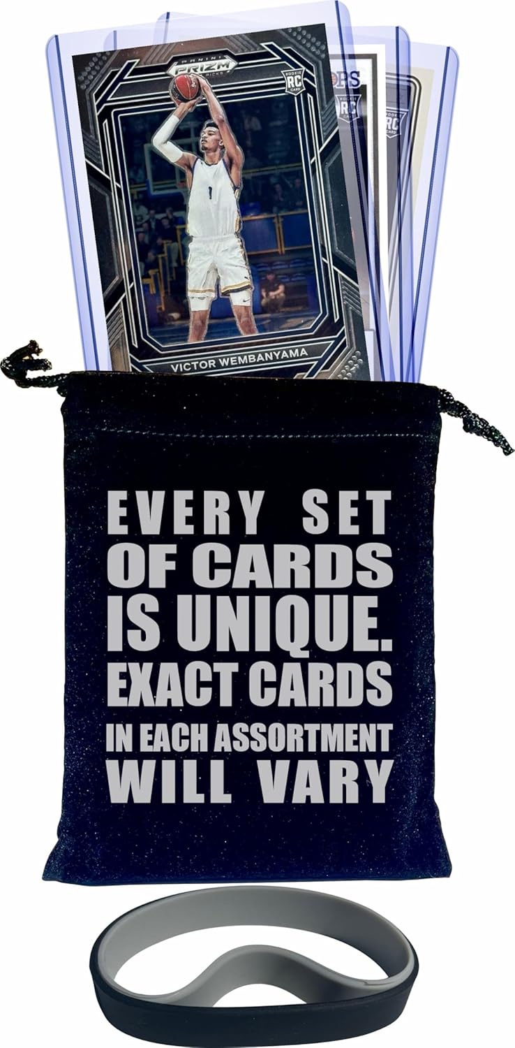 Grab this great lot of one of the new basketball players, Victor Wembanyama! Guaranteed to contain 3 authentic, licensed basketball trading cards of Victor Wembanyama. Exact assortment varies and could contain San Antonio Spurs uniforms. Each card comes in a protective sleeve and toploader case. The group comes in a gift bag with assorted color bracelets. Great for gift giving for collector's young and old.