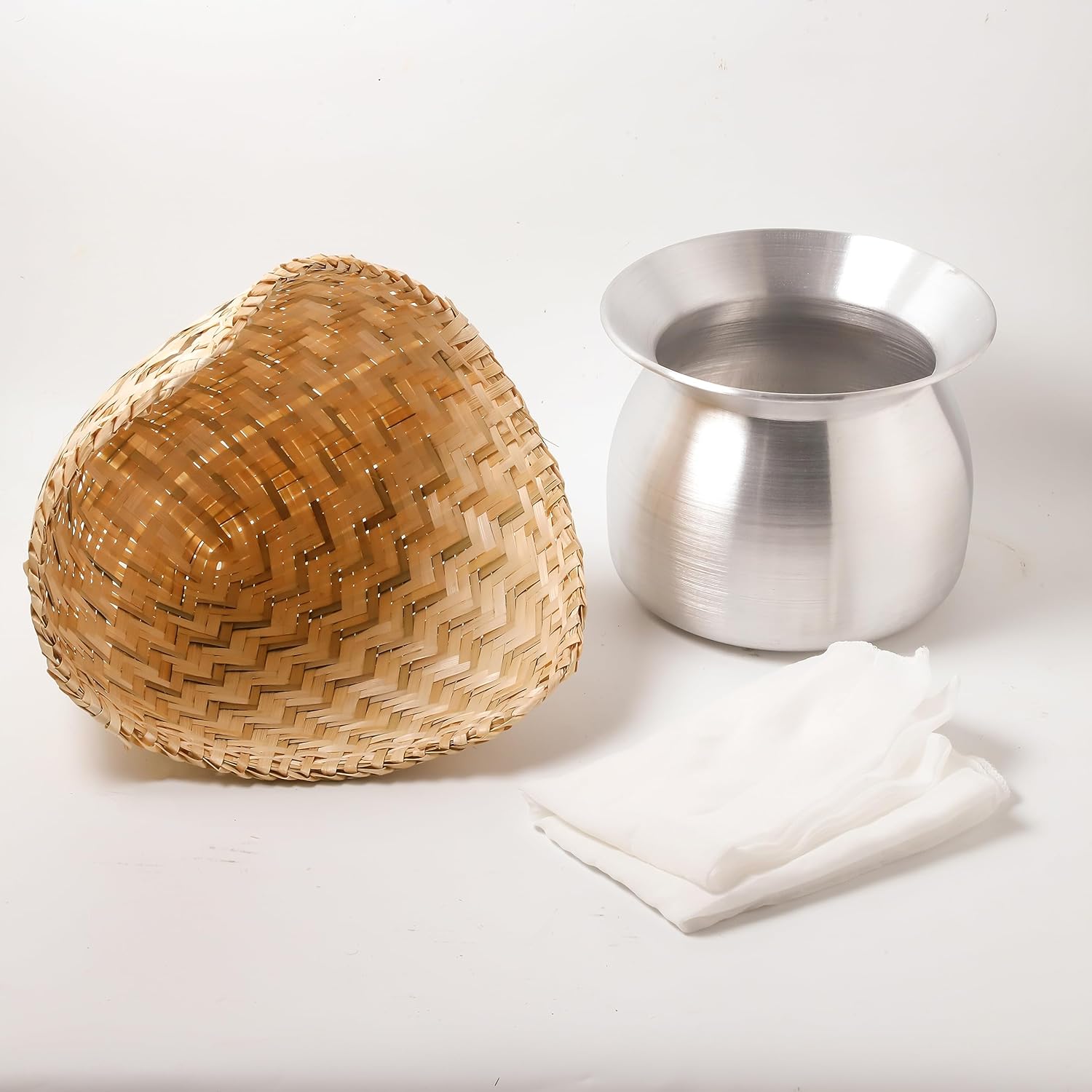 Description Aluminum cooker pot. Condition : New Quantity : 1 piece of Aluminum cooker pot Colors : Aluminum color (As picture) Size : Diameter 8” or 20.32 cm and Height 7” or 17.78 cm (Approx.) Material : Aluminum Product : Original from Thailand Description Sticky rice bamboo steamer basket (HUAD) with Cotton Cheesecloth Condition : New Quantity : 1 piece of Sticky rice bamboo steamer basket (HUAD) and 1 piece of Cotton Cheesecloth Colors : Bamboo color (As picture) Size : 12”x13”x12” or 30.48 cm x 33.02 cm x 30.48 cm (WxLxH) (Approx.) Material : Bamboo Product : Original from Thailand Product Description Thai Lao Streaming Sticky Rice Cookware Thai Food Menu Recipe Kitchen Tool. This Cookware design by the ancient Know how and still be the best way to cook Sticky Rice (Kao-Neaw). The set you will get a Weaving Bamboo ware and an Aluminum Pot. How to make sticky rice: 1. soak the sticky rice in water overnight (or at lest 4-5 hours) 2. After soaking the rice, then transferred it to a cone shaped basket used for steaming. 3. Placed the bamboo steamer over the steaming pot containing boiling water. 4. Usually it just takes 15-20 minutes. After 15 minutes you can remove the lid, and check to see if the rice is fluffy and not crunchy at all. If it’s still a little crunchy, just put the lid back on the basket, or whatever steamer you’re using, and allow to steam for a few more minutes.