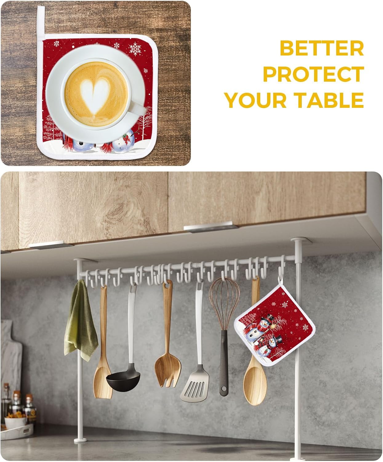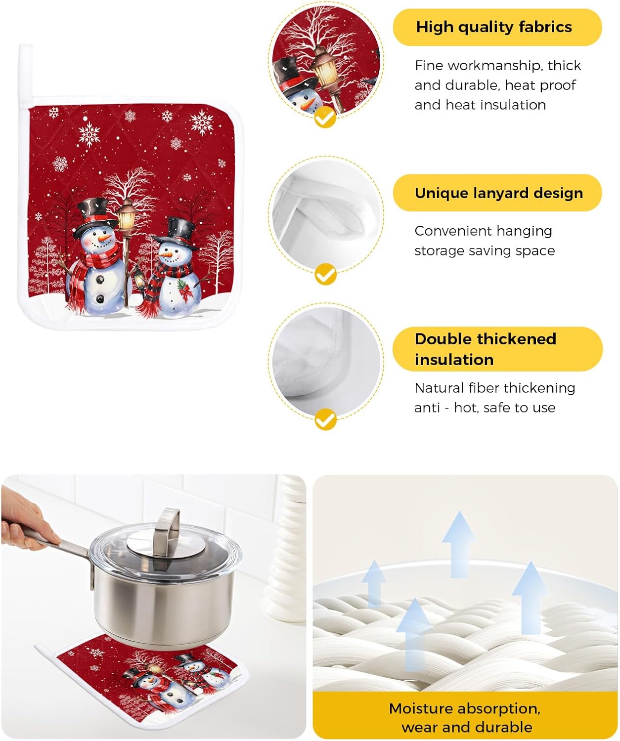 ★Any potholders must be insulated, high quality, and coordinated with the comfort of your kitchen! Made from double thickened cotton designed to provide high temperature protection for your hands and kitchen surfaces! Perfect for cooking, baking, serving or dinner parties. ★Everyday Kitchen Essentials★✓Use a hot pad on the table to place fondues and pans✓Use as a glove to safely remove from the oven or remove hot pans from the microwave✓Spoon holders for use as cutlery while cooking✓Can be used as a can opener✓Safe to use as food lids and microwave splash guards on small bowls and plates✓Coasters for pitchers and teapots✓Flat-lay pot holders protect kitchen and dining table surfaces★Quality You Can Trust★✓High quality designed with a beautiful textured outer layer and polyester padding for premium insulation. ✓Farmhouse kitchen pot holders are quilted and padded for extra protection. ✓Well sewn, the inner cotton won't fall off after washing, making dining table pads suitable for everyday use.✓These funny table potholders are soft and can be folded, you can easily put it in the kitchen drawer. ✓Perfectly designed with a loop for easy hanging. ★Designed for You★✓Each hot pads pot holders set features a unique pattern to make you stand out in your kitchen. ✓Can be used as hostess gift, housewarming gift and camping accessory. Creative gifts for Mother's Day, Birthdays, Thanksgiving, Christmas, New Years and more...✓Whatever your taste, our washable table pads are designed for you!