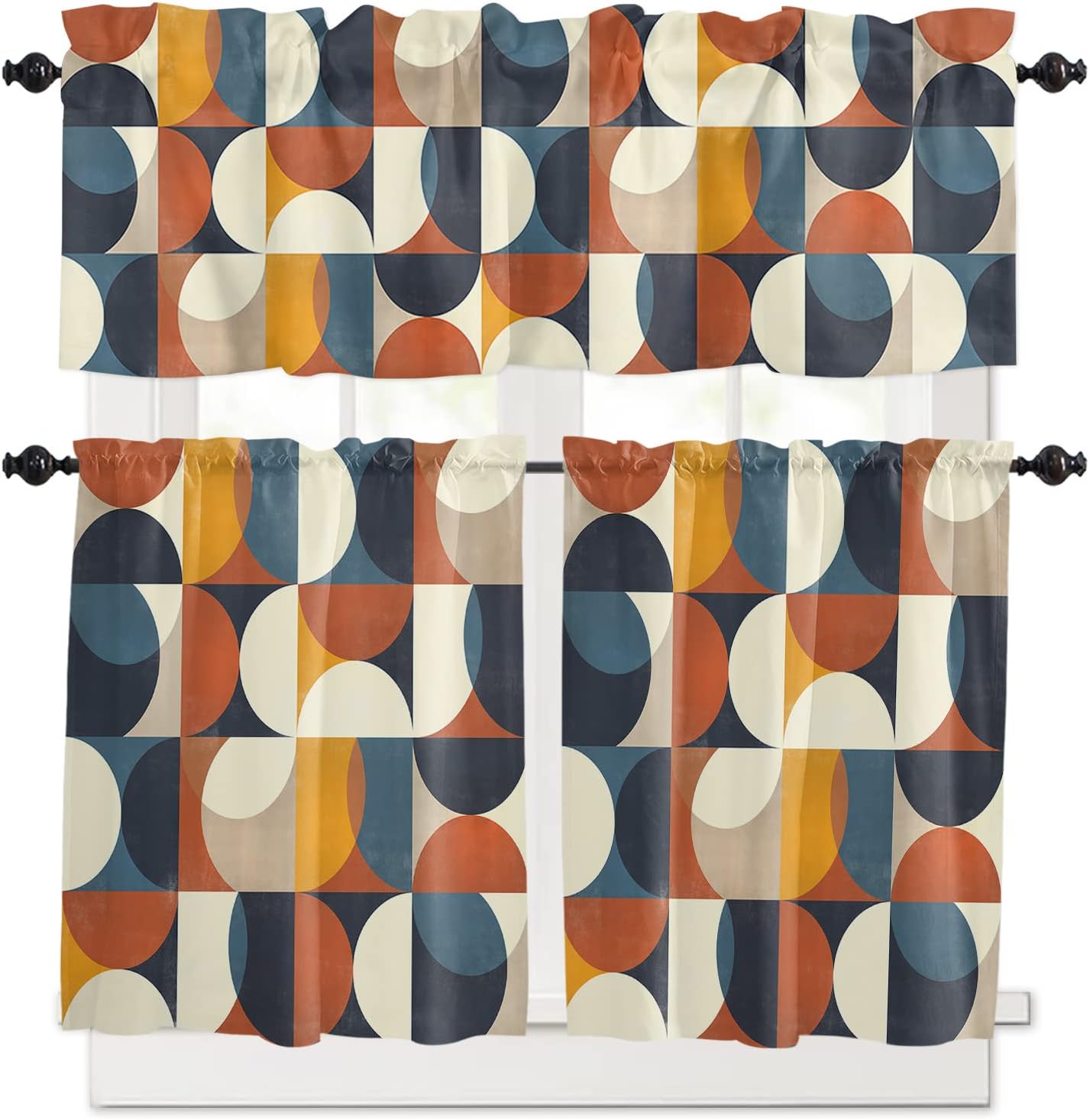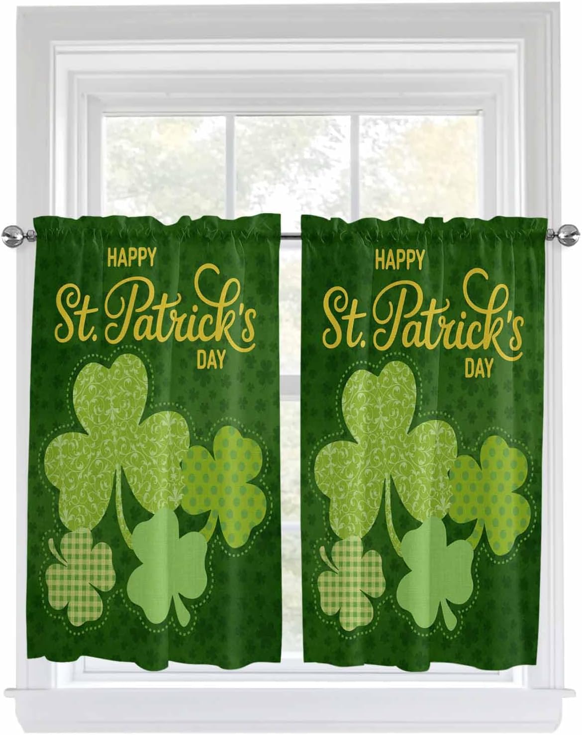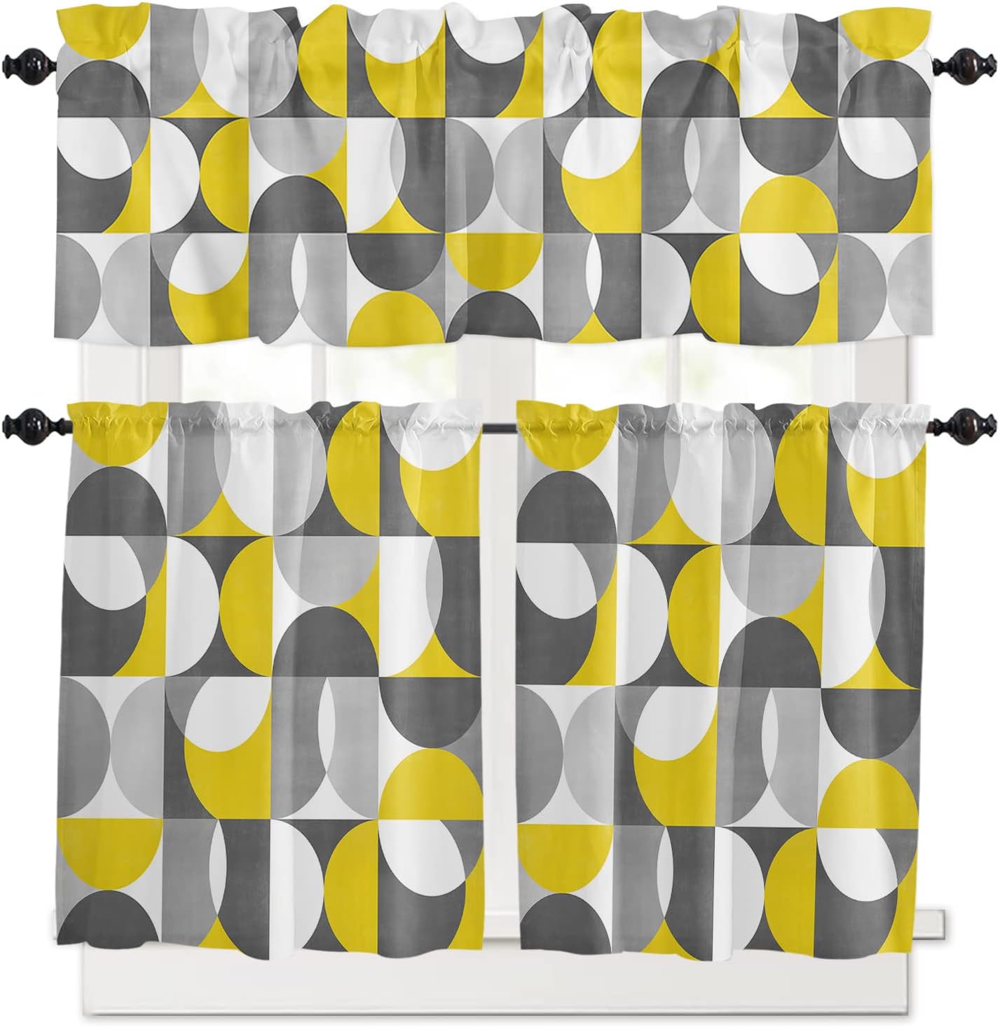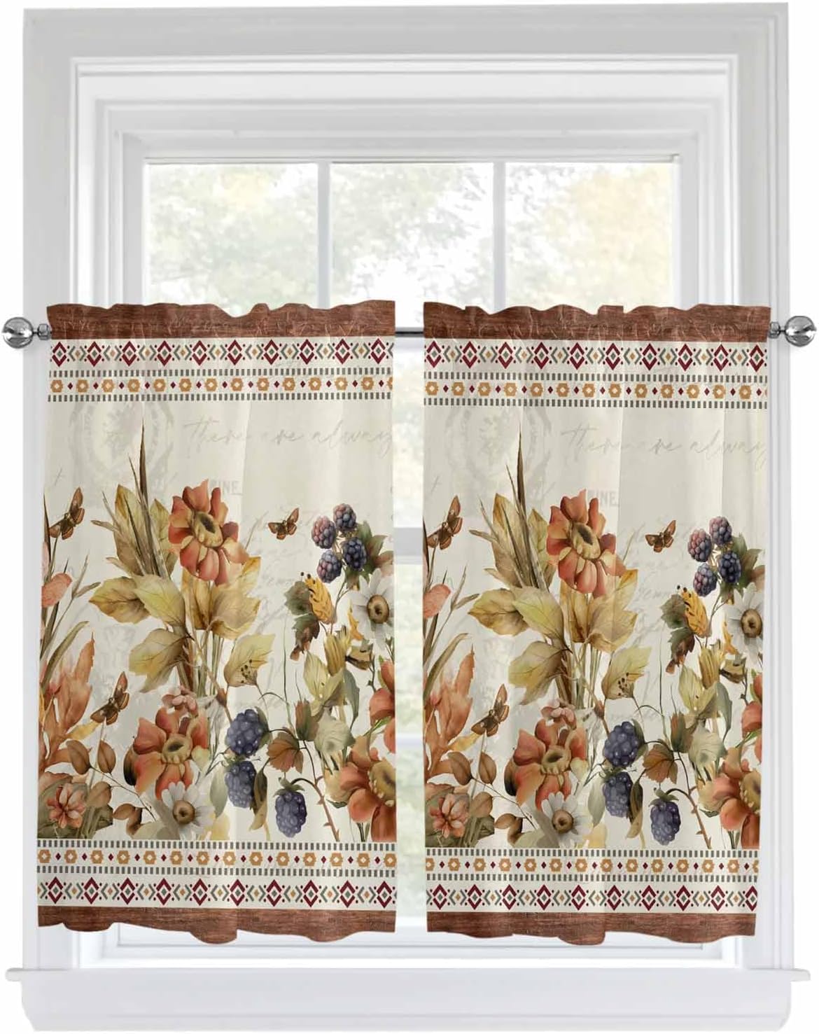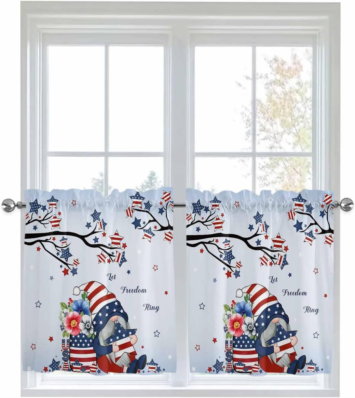 Kitchen Valance and Tiers Premium Fabric - The valance set is made of 100% high quality polyester, which is eco-friendly and skin- friendly. Light Filtering - Window Tier Curtains and Valance Set will filter out some of the light and heat from entering your room. Smartly allowing enough natural light into, while still providing enough privacy. Festival Print - This exquisite curtains printed with stylish pattern and bright color, enhances the style and festival atmosphere of interior space. Also a great holiday gifts for your family and loved. Rod Pocket Design - Constructed with 3"" rod pocket and 1"" header, fit well with standard or decorative curtain rods, which makes the curtains easy to install and slides. Home Decor - It easily match with many home decor styles. Whether farmhouse/farm, country/rustic, modern, retro, French or Nordic style, these stylish window curtains can complement it. Multi-scene Use You can use it everywhere you want, such as kitchen, basement, bathroom, bedroom, living room, nursery, Infant room and so on. Useful - Protect your furniture from fading and cracking caused by long-term exposure to ultraviolet rays. Care Instructions - It is easy to wash by machine in cold water, gently cycle. Do not bleach. You will get 3 panels in each package, include 1pcs short valance and 2 pcs curtain tiers Standard Size - Valances: 54" x 18" - Tiers: 27.5"x24"x 2 Panel or 27.5"x36"x 2 Panel Please make a measure before purchasing.