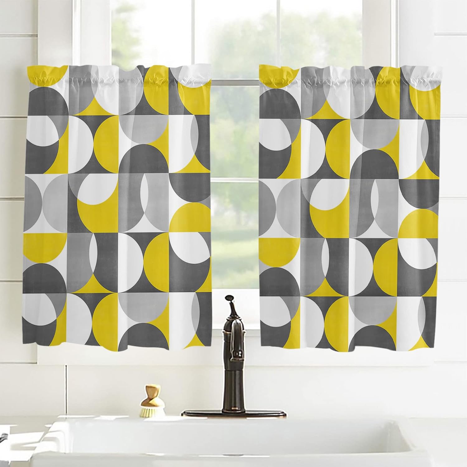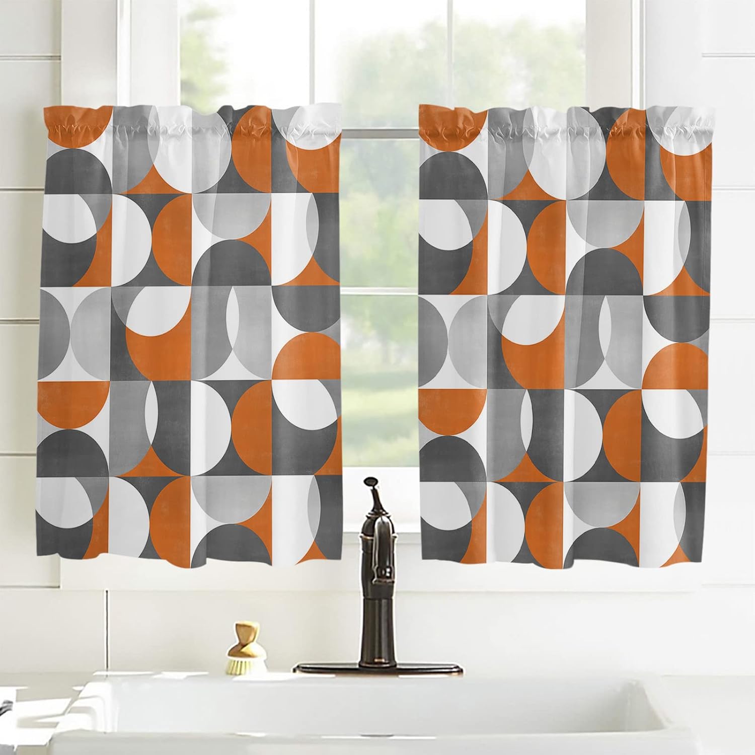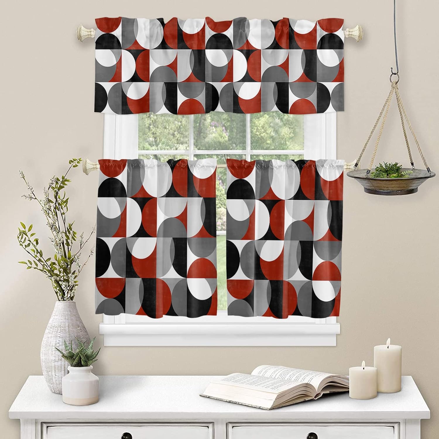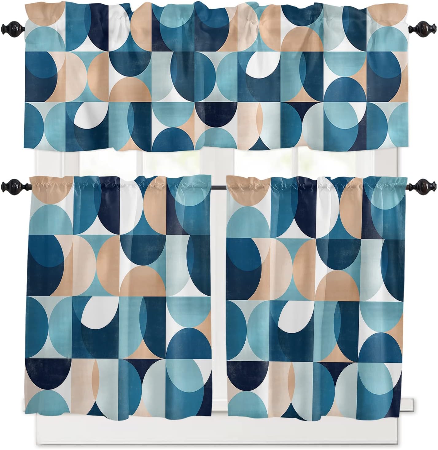 Kitchen Valance and Tiers Premium Fabric - The valance set is made of 100% high quality polyester, which is eco-friendly and skin- friendly. Light Filtering - Window Tier Curtains and Valance Set will filter out some of the light and heat from entering your room. Smartly allowing enough natural light into, while still providing enough privacy. Festival Print - This exquisite curtains printed with stylish pattern and bright color, enhances the style and festival atmosphere of interior space. Also a great holiday gifts for your family and loved. Rod Pocket Design - Constructed with 3"" rod pocket and 1"" header, fit well with standard or decorative curtain rods, which makes the curtains easy to install and slides. Home Decor - It easily match with many home decor styles. Whether farmhouse/farm, country/rustic, modern, retro, French or Nordic style, these stylish window curtains can complement it. Multi-scene Use You can use it everywhere you want, such as kitchen, basement, bathroom, bedroom, living room, nursery, Infant room and so on. Useful - Protect your furniture from fading and cracking caused by long-term exposure to ultraviolet rays. Care Instructions - It is easy to wash by machine in cold water, gently cycle. Do not bleach. You will get 3 panels in each package, include 1pcs short valance and 2 pcs curtain tiers Standard Size - Valances: 54" x 18" - Tiers: 27.5"x24"x 2 Panel or 27.5"x36"x 2 Panel Please make a measure before purchasing.