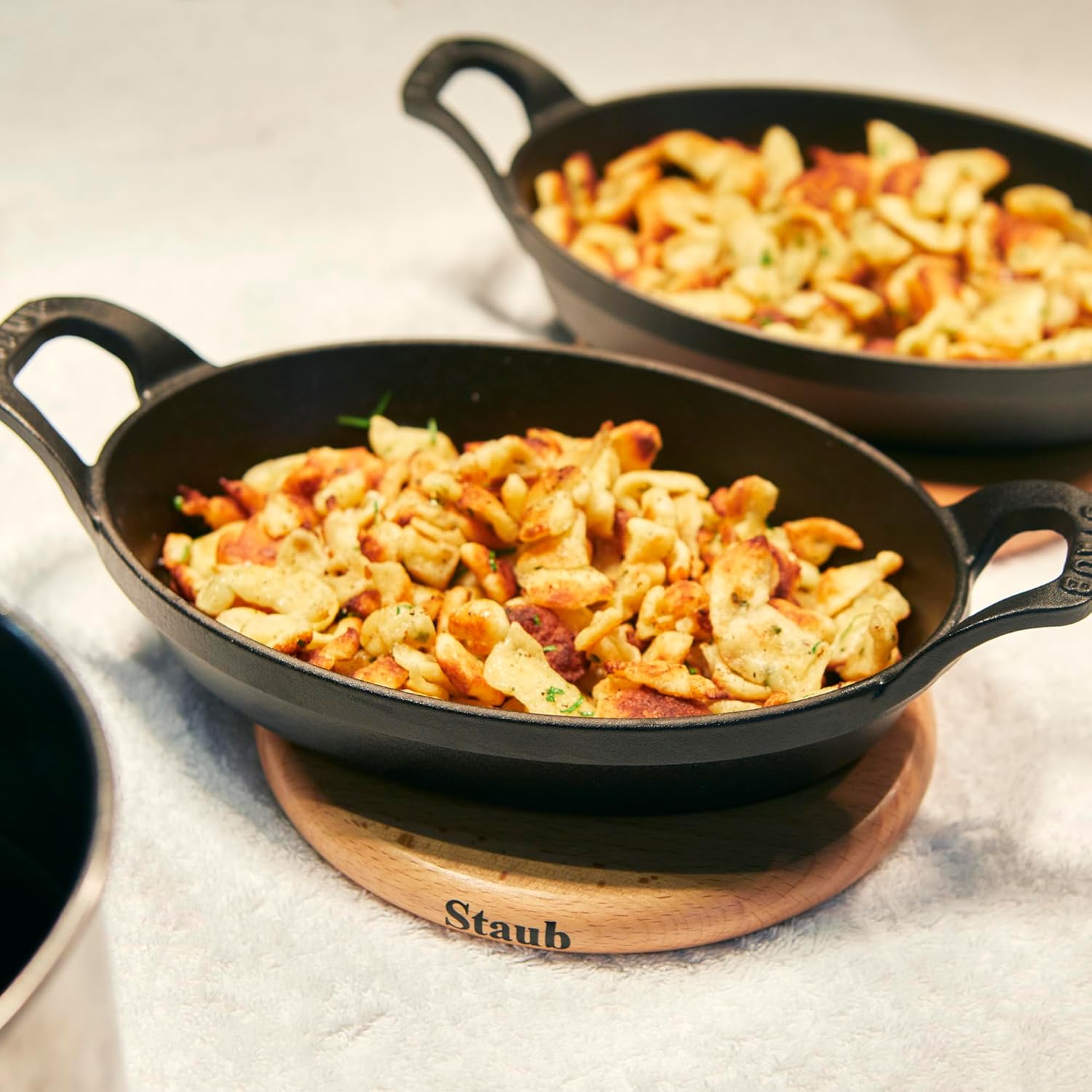 For centuries, cooks have taken advantage of the natural heat retention and redistribution properties of cast iron. Staub builds on this tradition with our enameled cast iron cookware. Black matte enamel inside and cooking surface creates a culinary advantage for better browning, braising, and roasting. Colorful enamel outside adds flare to your kitchen and table. Safe for use on all types of heat sources, including gas, electric, and induction, and oven safe up to 500F. Chip resistant and dishwasher safe. Made in France.