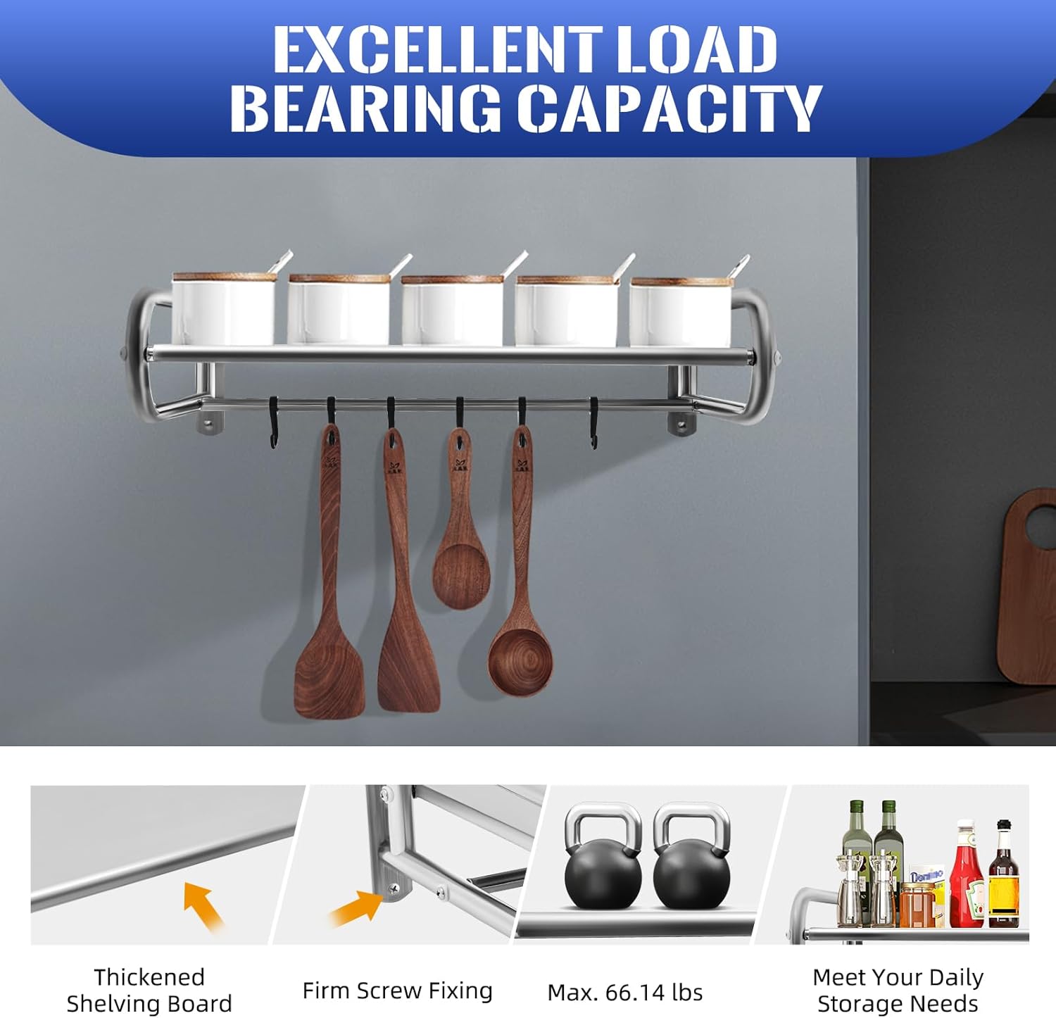 Description Do you want to keep your kitchen neat and organized? This 2 tiers adjustable microwave stand is aimed to save your valuable kitchen space to place your kitchen supplies. It is also a good choice for other space-saving desires like a bathroom, bookroom, office, and utility room. This fashionable and beautiful stand will be a delicate addition to your room. DetailsHanging Hooks: There are 6 hooks on the top bar for hanging small items such as towels, spatulas, and scissors, to make maximum use of storage space. The S-shaped hooks are easy to install and can be freely relocated. Rounded Corner: It can effectively prevent accidental scratches, making it safer and more reliable to use.Practical Guardrail: It can ensure the stable placement of items and prevent them from falling, making it more secure to use.ApplicationThis item can be widely used in the kitchen, living room, study, balcony, restaurants, bathroom, etc. to place various items and decorate the space. You can place many items on it such as microwaves, toasters, utensils, bottles, spices, condiments, canned foods, dishes, pots, pans or any other kitchen utensils.SpecificationsMaterial: Stainless SteelColor: SilverProcess: Wire DrawingThickness: 0.68mm/0.03inMounting Type: Wall-MountedShape: RectangularStyle: ModernNumber of Pieces: 1Assembly Required: YesMaximum Loading Capacity: 30kg/66.14 lbsOverall Size: 53 *38 *18cm/20.87*14.96*7.09inBoard Size: 48*38*2cm/18.9*14.96*0.79inGross Weight: 2.11kg/4.65 lbNet Weight: 2kg/4.41 lbPacking Size:59*38*8cm/23.23*4.96*3.15inPackage Included1*Microwave Stand6* HooksOther Accessories for Assembly Notes1.Please do not use corrosive cleaners to clean the surface of the product.2.The product should be placed in a balanced and ventilated place.3.Please avoid violent collisions and friction to avoid damage to the product surface.4.Please allow the slight color difference caused by the shooting light and 1-3cm error due to manual measurement, and make sure you do not mind before you order.