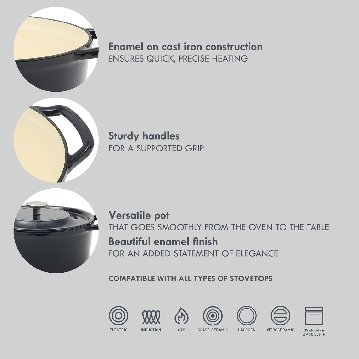 Invest in a kitchen staple that will serve up delicious dishes for years. The Kenmore® Oak Park 5-quart Enamel Cast Iron Dutch Oven with Lid in Metallic Blue has unparalleled heirloom quality from its durable enamel cast iron construction that distributes heat evenly. The enamel interior resists scratches and stains while the exterior upgrades food presentation with its glossy color finish. Equipped with robust handles, it provides a secure grip when serving from oven to table. Its self-basting lid redirects moisture back to the food to ensure tender and flavorful results whether you are slow-cooking, braising, baking, and more. Handwash recommended. The trusted performance of Kenmore® helps create amazing things in the kitchen. For over 100 years, Kenmore® has delivered high-quality, durable products for the home. Made for everyday excellence no matter now simple the task, Kenmore® has the innovation to amaze.