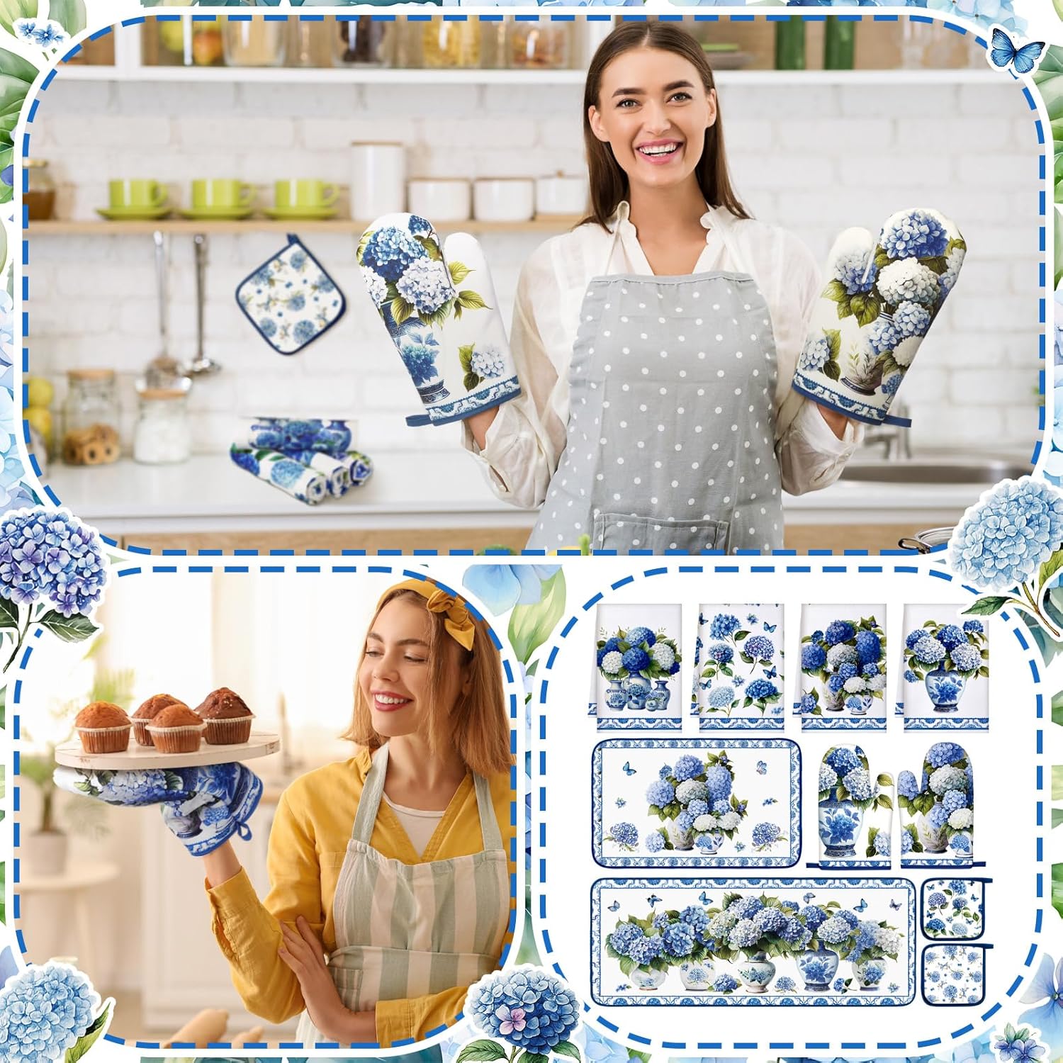 Features: The kitchen towels and oven mitt sets are vibrant in colors, delicate in craftsmanship, full of floral charm, adding a touch of freshness and elegance to your home. The hydrangea kitchen towels set are designed with attractive, eye catching and lovely patterns that symbolize natural beauty, the nice combination of decorative style and daily use. Specifications: Material: Towel: microfiber Pot Holders: polyester fiber, insulation cotton Mitts: polyester fiber, insulation cotton, non woven fabrics Mat: polyester fiber Color: multicolor Size: Towel: about 15.75 x 23.62 inches/ 40 x 60 cm Pot holder: about 7.09 x 7.09 inches/ 18 x 18 cm Mitts: about 6.69 x 10.63 inches/ 17 x 27 cm Mat: about 31.5 x 19.69 inches/ 80 x 50 cm, 47.24 x 19.69 inches/ 120 x 50 cm Package includes: 2 x Kitchen rugs 4 x Kitchen towels 2 x Pot holders 2 x Oven mitts Notes: Manual measurement, please allow slight errors on size. The color may exist a slight difference due to different screen displays