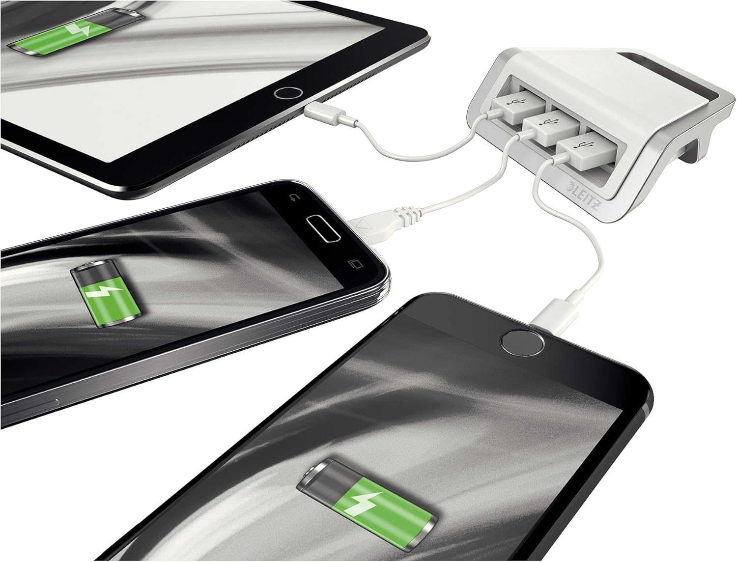 Compact charger for simultaneous charging of 3 mobile devices. The universal charger is compatible with iPhone and all other mobile devices. Stylish and slim design - perfect for a modern office demands. Stylish to detail.