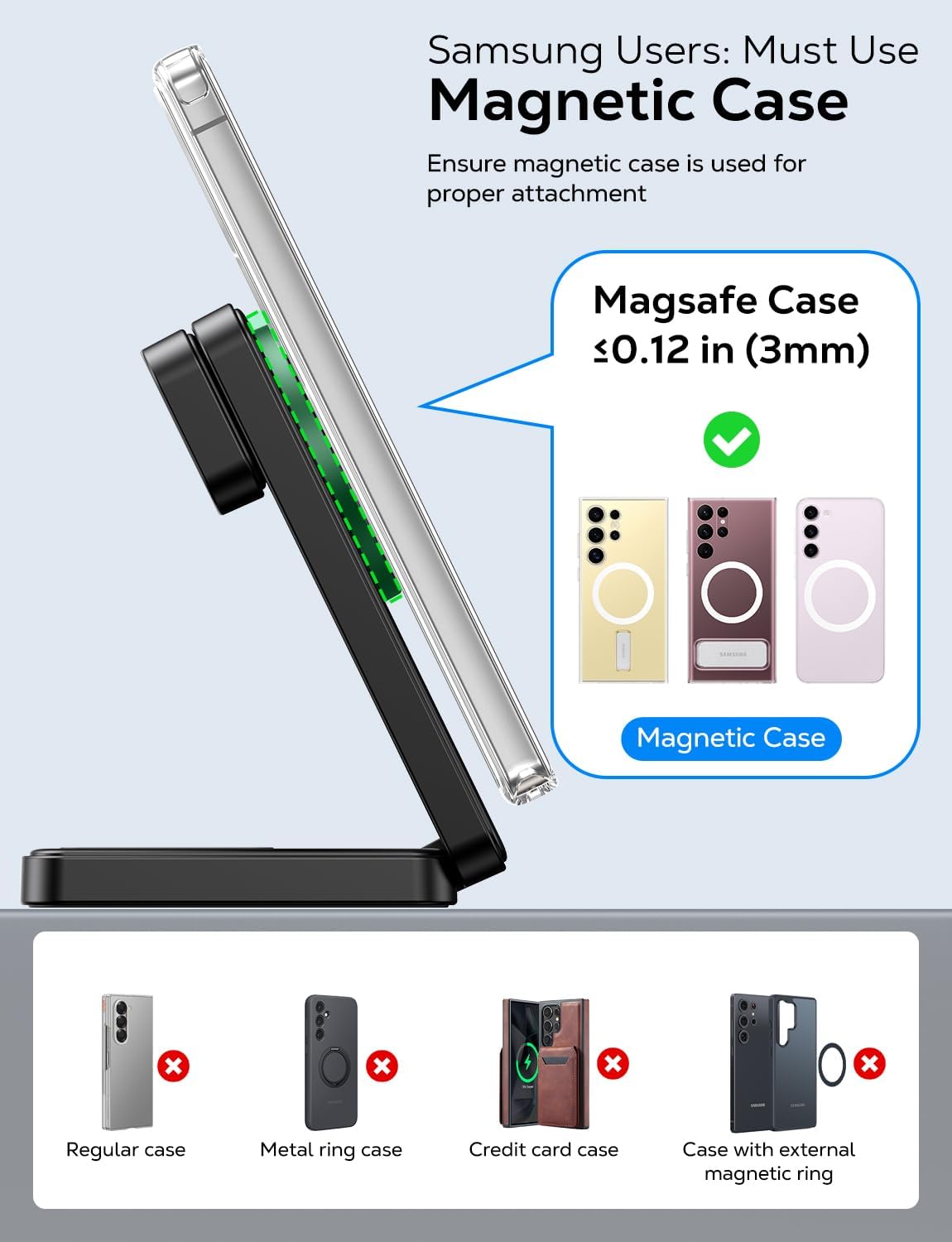| Additional Features | ①Strong Magnetism; ②Mag safe Compatible Samsung Galaxy Phones ③Portable & Foldable Design for Travel;④Multi-Angle Adjustment; ⑤Rotatable Galaxy Watch Charging; ⑥15W Fast Safe Charging |