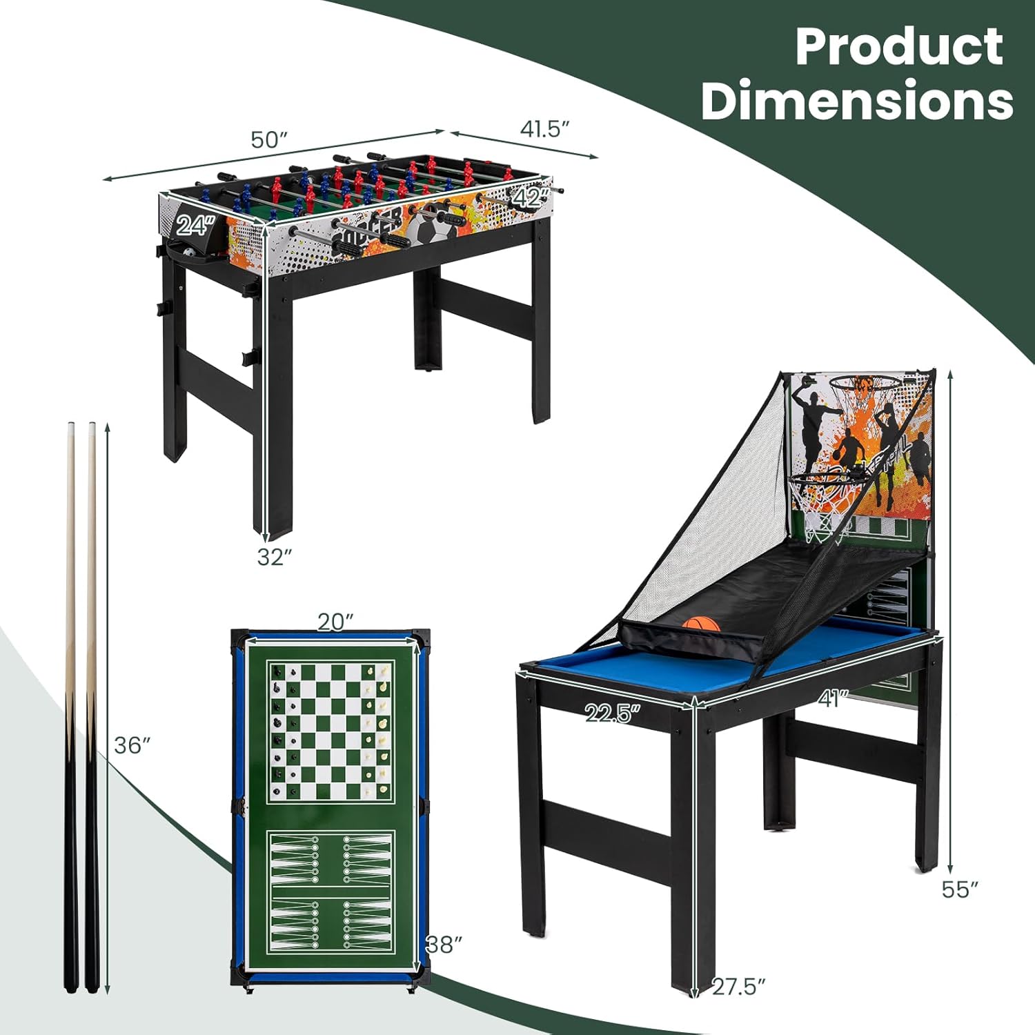 | Included Components | 2 x Table Tennis Paddles & Balls;2 x Cue Sticks;2 x Soccer Balls;2 x Chalks;1 x Net & Post Set;1 x Triangle;1 x Billiard Ball Set ;1 x Bowling Ball Set;1 X Backgammon Set;1 x Checker Set;1 x Ring & Horseshoe Set;1 x Poker Card Set;1 x Shuffleboard Set;1 x Chess Set;1 x Hockey Game Set; 1 x Basketball Game Set; 1 x Tic Tac Toe Set |