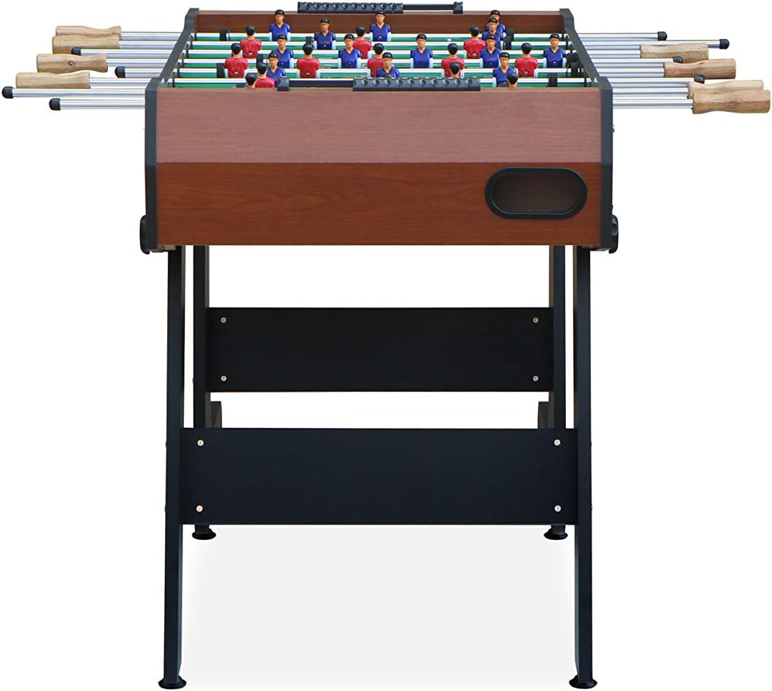 About KICK Foosball TablesFoosball is back! Our founder, a recognized Foosball enthusiast, dreamed of a high-quality game table that other Foosball lovers could enjoy- without the high price. After years of research, design & development, KICK was born, creating a new standard in Foosball tables. KICK it old-school style & get your very own KICK Foosball Table today!You will reign like a Monarch over the foosball table world with the KICK Monarch 48” Foosball Table. With its folding black legs & its medium wood grain, the Monarch will compliment any décor that comes your way. The unique folding legs make storage possible several different ways. It can even be stored upright! The KICK Monarch will give you the playing experience you are looking for with the convenience of storage options. Enjoy the two sets of players in blue & yellow & precise player control as well as your choice of 1- or 3-men goalie set up. Technical Specifications:-Table Weight: 60 Lbs-1/4" Playing Field-Convenient Ball Return on Each End of Table-Slide Scoring Mounted On Each End of Table-1-Goalie Design or 3-Goalie Design (Ramps Provided)-8 Durable ½” Semi-Solid Stainless Steel Chrome-plated Rods-13 Red & 13 Blue Uniformed Foosball Men (Home & Away)-2 KICK Soccer Style Foosballs-8 No-Slip Wooden Handles-Lifetime Warranty (Only on New Tables Purchased From KICK)- Free Rod Lubricant (Upon Request & Shipped Separately, Contact KICK with your shipping address). Remember all KICK tables have a LIFETIME warranty on all parts, so rest assured you’re covered!