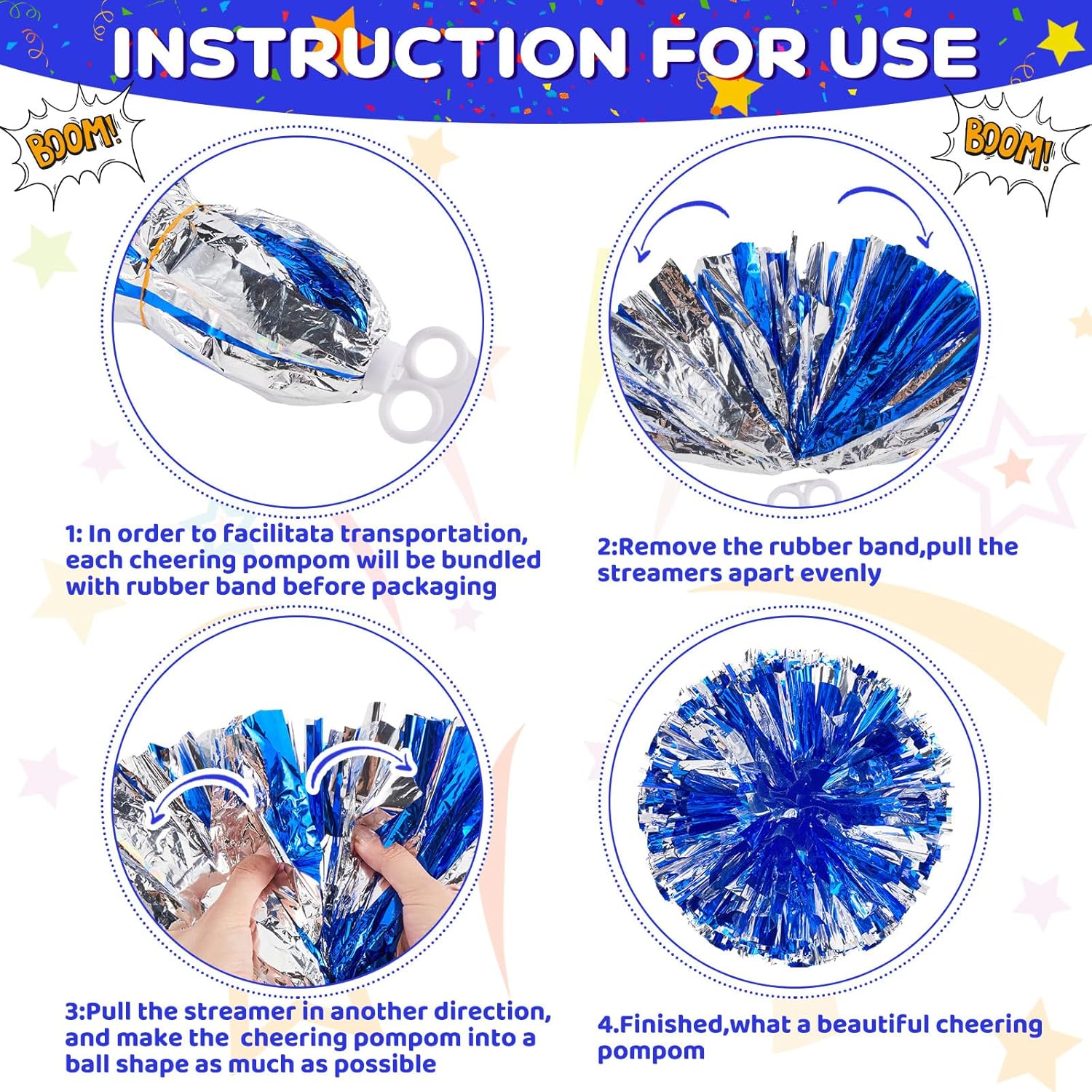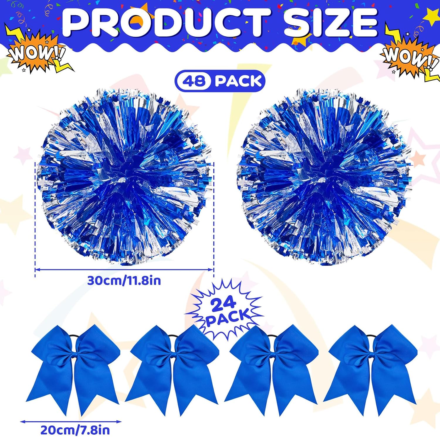 Features: Our cheerleader pom poms offer easy grips, and come with sturdy cheer hair bows that hold stably to amount of twirls and jumps. Standout in performances as you cheer and twirl without worrying about slips or mishaps. Our cheer accessories for cheerleaders are not just for cheerleading. They can also be applied in cosplay, sports events, team spirit rallies, and theme parties. Add some shine and excitement to many events. Specifications: Material: Pom pom: tinsel, plastic Cheer hair bow: polyester Pom pom color: silver Size: Pom pom: about 11.81 inches/ 30 cm Cheer hair bow: about 7.87 inches/ 20 cm Package includes: 48 x Cheerleading pom poms 24 x Cheer hair bows Notes: Manual measurement, please allow slight errors on size. The color may exist a slight difference due to different screen displays.