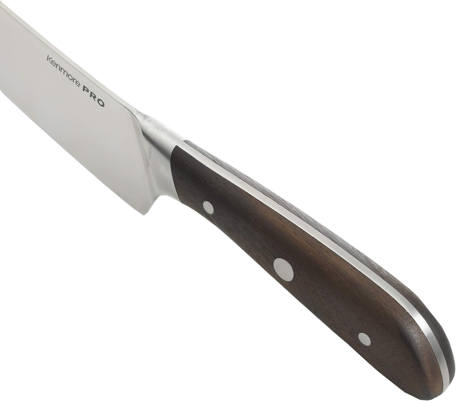The Kenmore Pro Truman 6-Piece Stainless Steel Cutlery Set includes essential professional-quality knives you need for everyday cooking. Comes with five knives: chef’s knife, bread knife, carving knife, serrated knife, and paring knife, as well as a heavy rubber-coated pine wood block to store them— all featuring richly-hued walnut wood. Made from high quality stainless steel and sharpened against a diamond wheel, the full tang knives in this set provide exceptional sharpness. Sturdy ergonomic handles with bolsters help safe, precise cutting. And everything stores securely in a storage block that looks great on your kitchen counter. Experience cutting edge performance with Kenmore's Truman 6-Piece Stainless Steel Cutlery Set. Perfect for veteran chefs or others simply looking to expand their culinary palate, the Kenmore Truman 6-Piece stainless steel cutlery set performs under pressure and delivers delicious results.