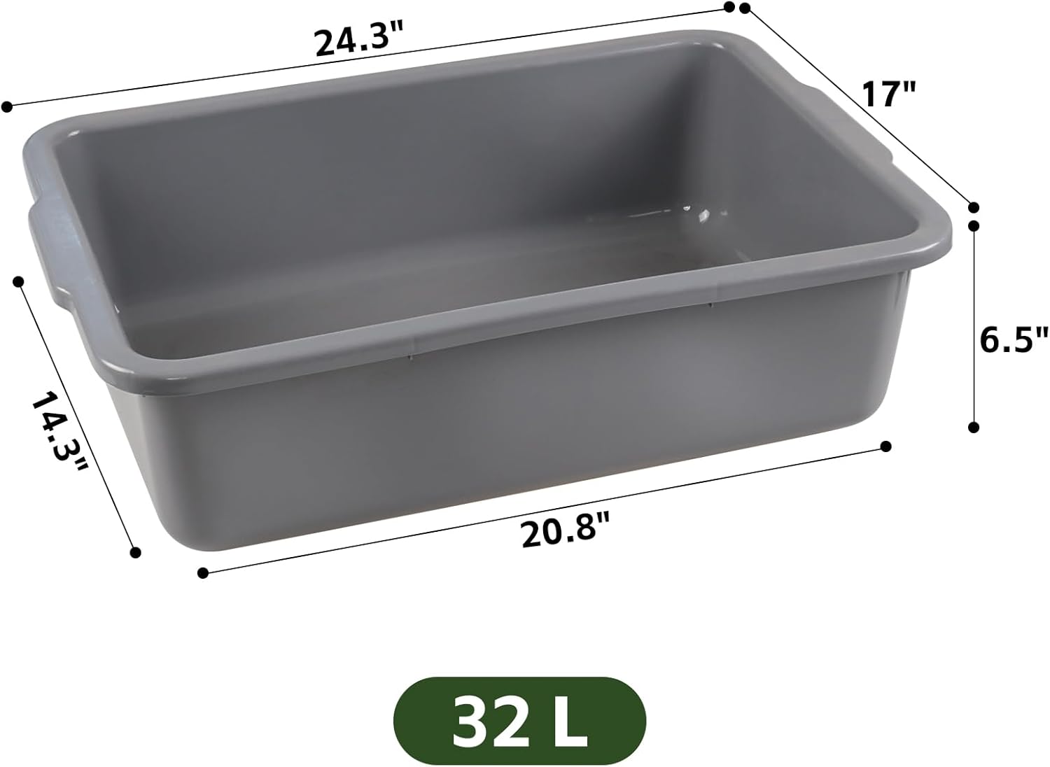 4-Pack 32 L Commercial Bus Tub, Large Plastic Rectangular Dishpan Tub, Grey