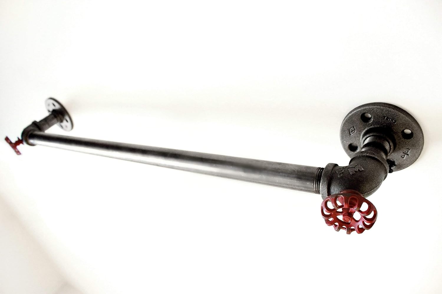 Industrial Pipe Towel Bar / Steampunk Towel Hook Description: Handmade towel bar / Hooks Serves a bathroom towel holder and washcloth hook Made with industrial pipes (Black or galvanized pipe available) This decor / accent piece is designed to suit industrial & steampunk styled rooms it will add an awesome focal point to your space! CUSTOM OPTIONS: SIZE: 27.5", 23.5" 17.5" 12.5" (Measured end to end of mounting flanges, subtract 2" for actual bar length) PIPE COLOR: Black pipe as shown or a silver colored "galvanized pipe" (option offered at checkout, costs a bit extra for galvanized) HOSE KNOB COLOR: If you select the hose knob option I can customize the color of the knobs, I have White, Green and Red hose knobs in stock, please contact me for custom colors. PLEASE NOTE: Because each of our items are handmade please allow 1-2 weeks processing time for all orders, If you need it sooner than that please contact me to make special arrangements :) We sell many steampunk and industrial light fixtures and home decor Items. Please see our shop or contact us to create a custom piece for you!