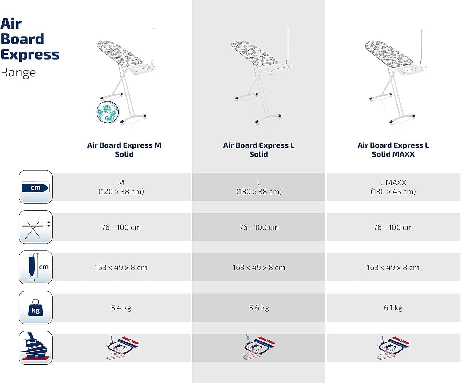 The ideal ironing board for the use of steam iron stations The ironing board is equipped with a large iron rest for the safe standing of the steam iron station. In addition, the cover made from pure, perforated cotton ensures optimum steam penetration._Ultra-light and stable with extra-large ironing surface, perfect for using a steam station. The Leifheit Air Board Express L Solid has everything a modern ironing board needs. It is lighter than any expanded metal ironing board, but completely stable, and has an extra-large ironing surface with a cover made from pure perforated cotton. The cover lets the steam from the iron through and ensures optimum moisture absorption. Setting up and putting away the Air Board Express L Solid is simple with the ironing surface that’s made with an ultra-light special plastic. The 130 x 38cm ironing surface rests on a 35mm thick, completely stable tubular frame. It can be raised to a height of 100 cm, adjusting to suit all heights and working levels. The ironing board has a solid steam station tray made of metal fitting all commonly used types of steam station with a secure rest for conventional irons. Shirts or jackets can be hung on the clothes hanger holder on the tray after ironing. It includes a cable flex holder to stop power cables getting in the way of your ironing. Ideal for steam stations thanks to the steam permeable cover made of perforated cotton Ultra-light ironing surface (130 x 38 cm) made with special plastic for easy opening and closing of the board Height adjustable to ensure the best working height that is comfortable and kind to the back (between 76 to 100 cm) Fixed tray for steam stations (26 x 37 cm) including clothes hanger holder and cable holder Stands securely thanks to the stable frame with flexible mechanism to compensate for uneven floors Transport lock for easy carrying and space-saving storage Suitable for irons and all standard steam stations