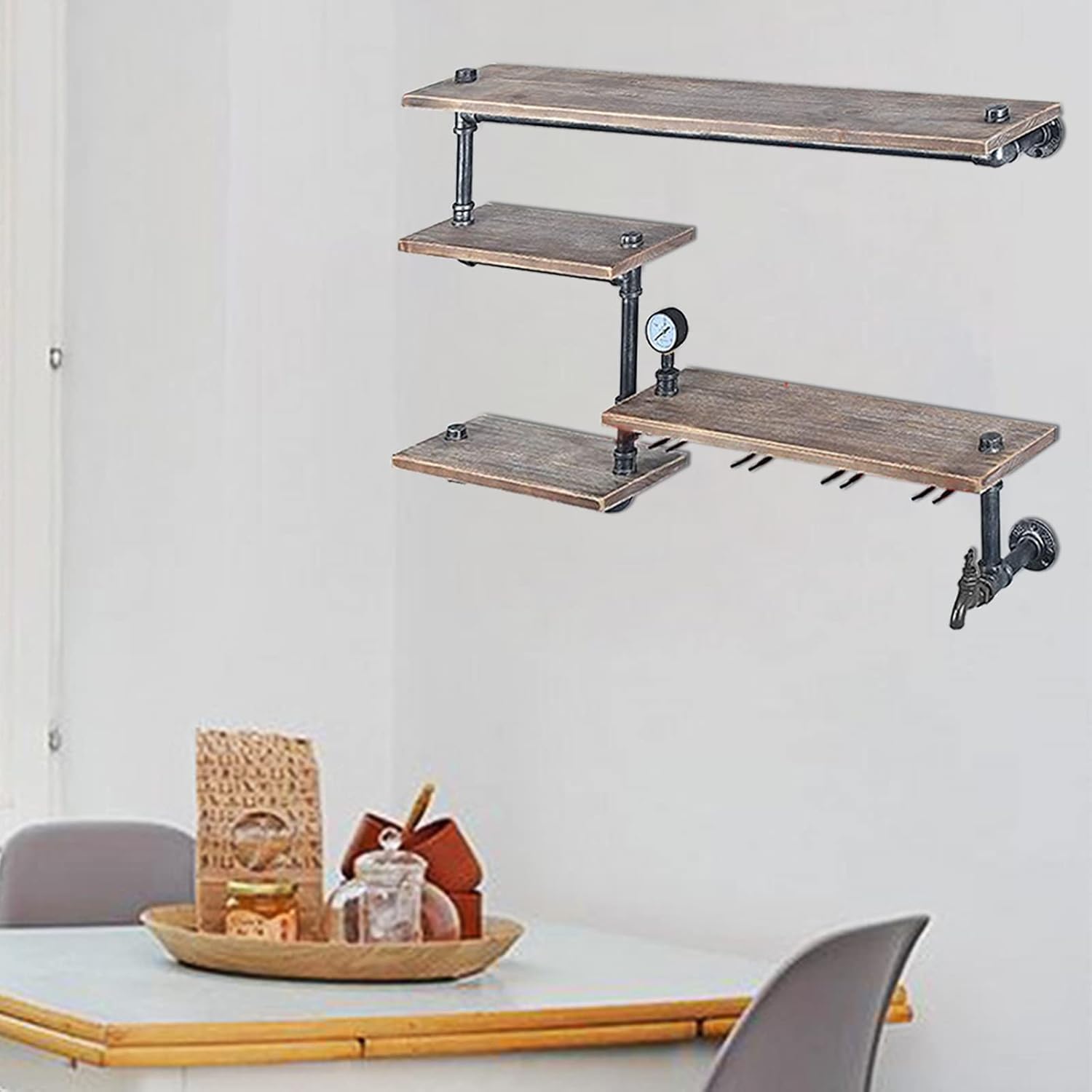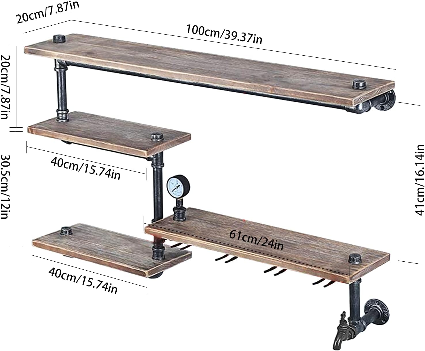 DENESTUS Industrial Pipe Shelf Wine Racks with 4 Stem Glass HolderSpecifications:Material: Iron And Wood.Color: As Shown In The Picture.Dimensions: 100x20x70.5cm/39.37x7.87x27.76inchBearing Weight: 50kgNumber of floors: 4 Weight:7.5kgPackage Contents:1 x Shelf (Fasteners Included).