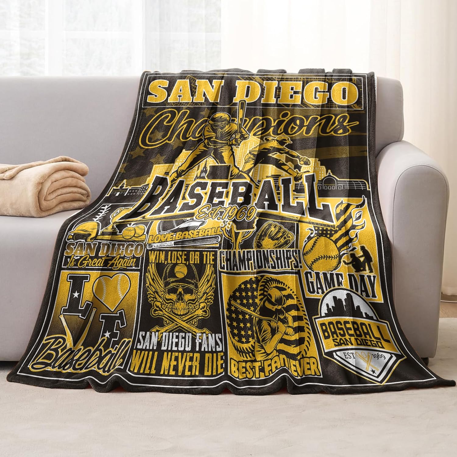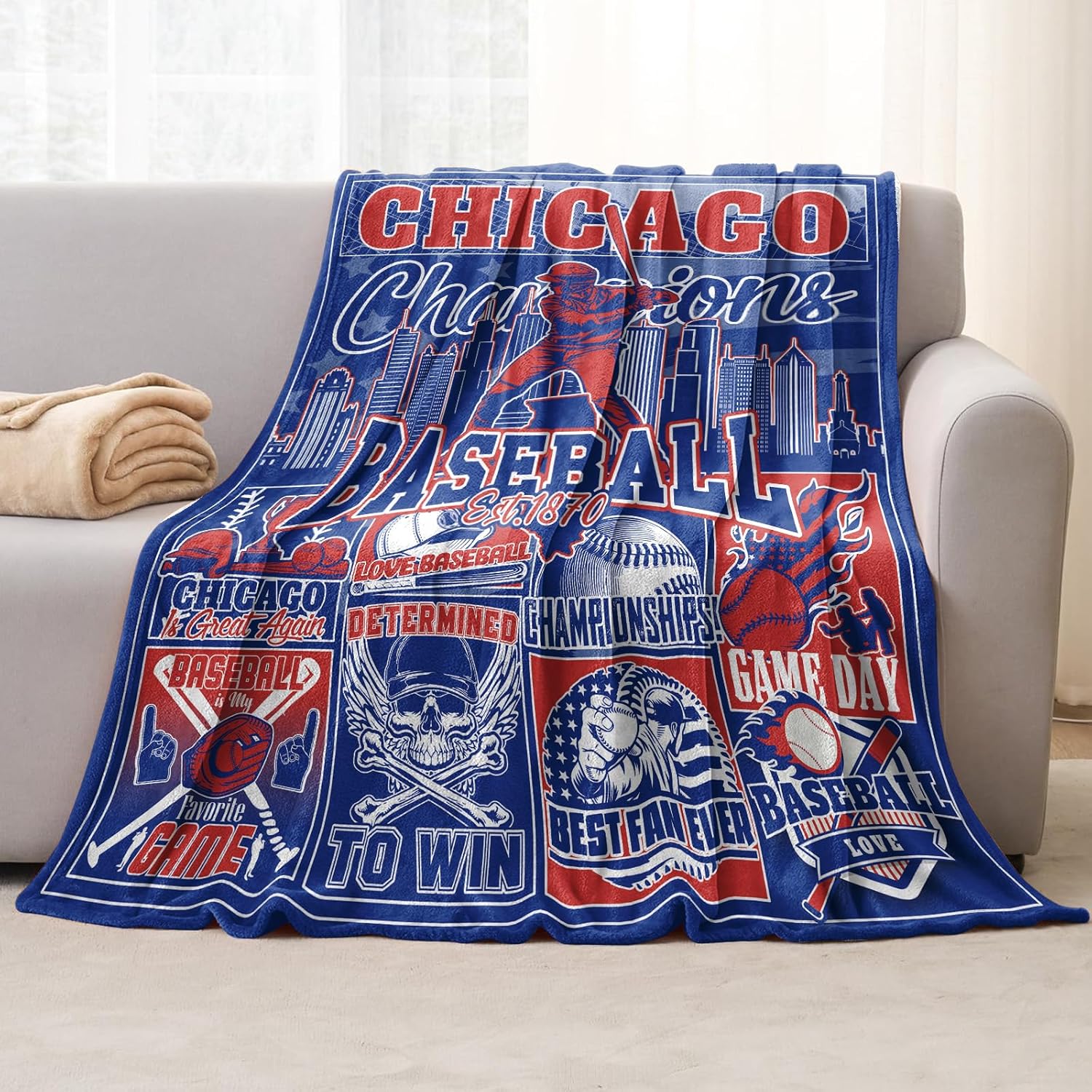 This is a lightweight, baseball-themed print blanket made from very soft material. Please note the print is on one side only, with the reverse being plain white. It would make a great holiday or birthday gift for the sports enthusiast in your life.