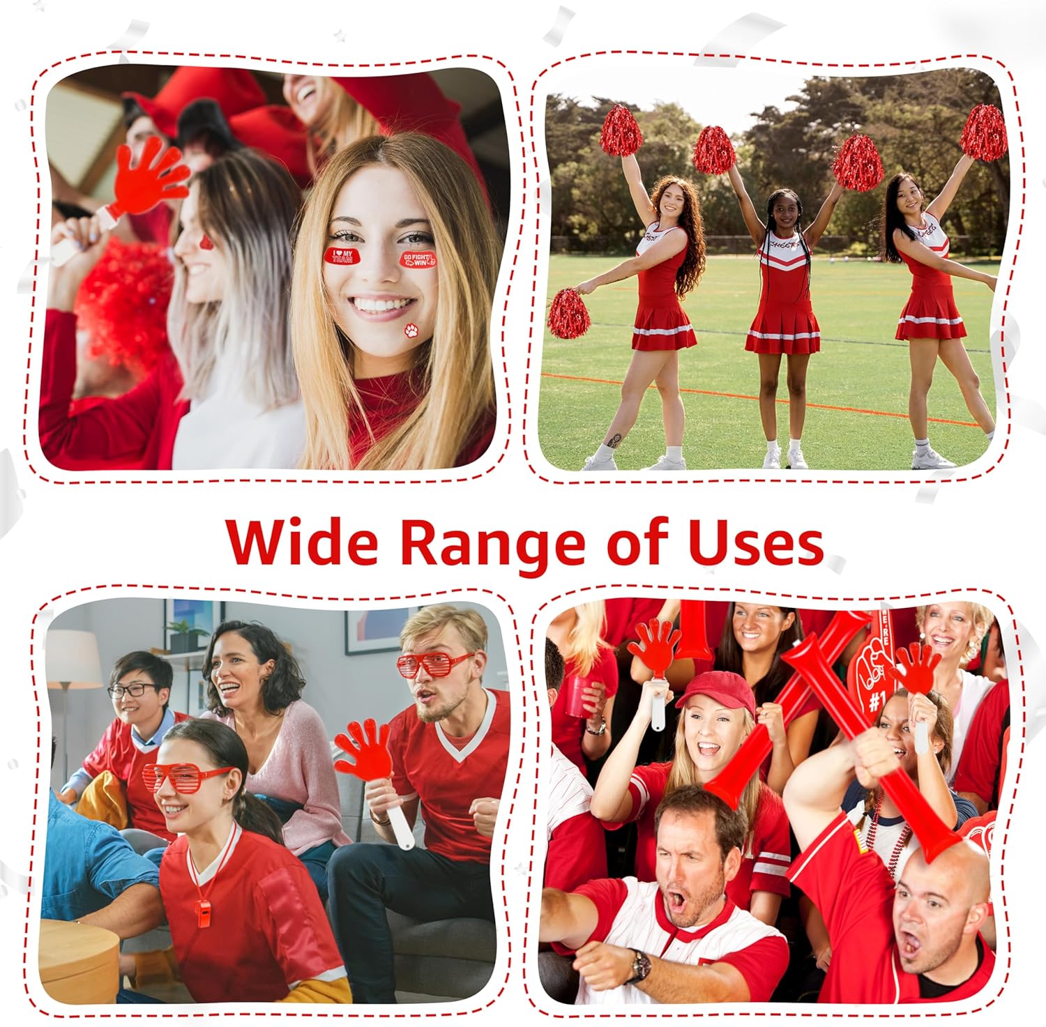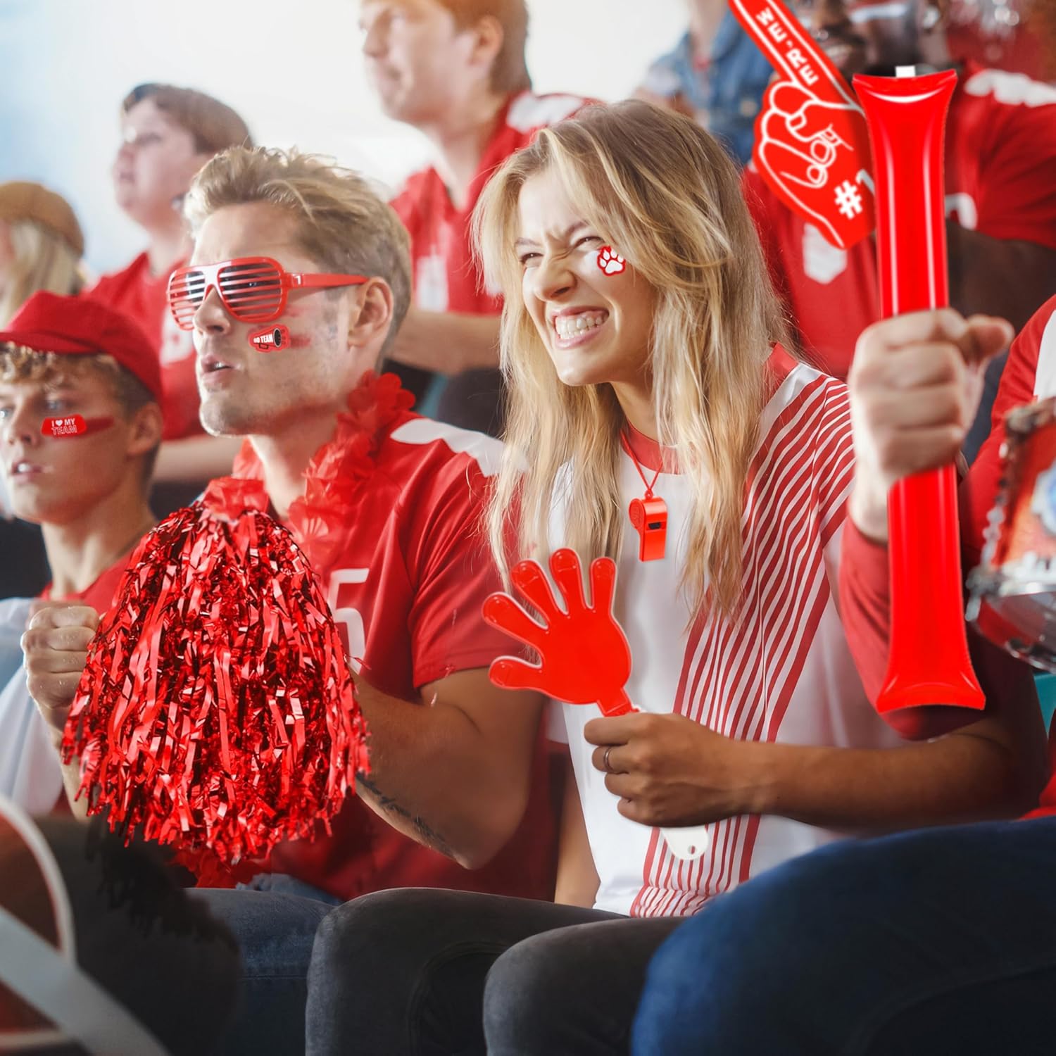 PACKAGE INCLUDES:12 x cheer pom poms 12 x hand clappers 12 x thunder sticks 12 x whistles with lanyards 12 x shutter glasses 12 x EVA foam cheering gloves 16 x sports-themed sticker sheets (132 stickers in total)
