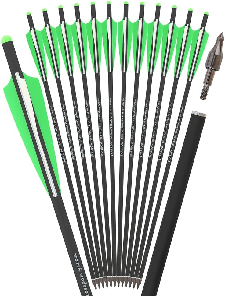Item Name: 16/17/18/20/22 inch Carbon Crossbow Bolts Arrow Length: 16/17/18/20/22 inch for option Shaft Material: mix Carbon fiber Shaft ID: 7.6mm(.299") Shaft OD: 8.8mm(.346") Arrow Head: 125 grain removable screw in arrow tips + Aluminum Insert Arrow Vanes: 3 pieces 4 inch Plastic Vane Arrow Nock: Half Moon shape plastic insert nock Carbon Crossbow Bolts Total Weight: about 27.8g (20inch) (including the arrowhead), measurement by hand, please allow an error. Hunting Broadheads: 100grain Package includes: 6/12 x crossbow bolts + 6/12 hunting broadheads Warm Note: 1. Consult with professionals and laws before use. Designed for adults target practice / hunting only, crossbow bolts shooting at a fast speed can harm with its super-sharp metal tips. 2. The arrow tips are sharp, when you play the arrow in backyard or outdoor, please make sure no any bystander near them. Never shoot at a person, it would be very dangerous. 3. If the plastic vane shape is distorted, you can put the vane into 80 to 90 Degrees Celsius hot water for a few minutes, it can be recover the original. 4. Do not shoot on the hard objects, such as metals, stones, cement, or plywood, or the metal tips would be harmed, although it is very solid. 5. Load one bolt at a time into the magazine making sure that the bolts are aligned and stacked properly with the flight track in the horizontal position.