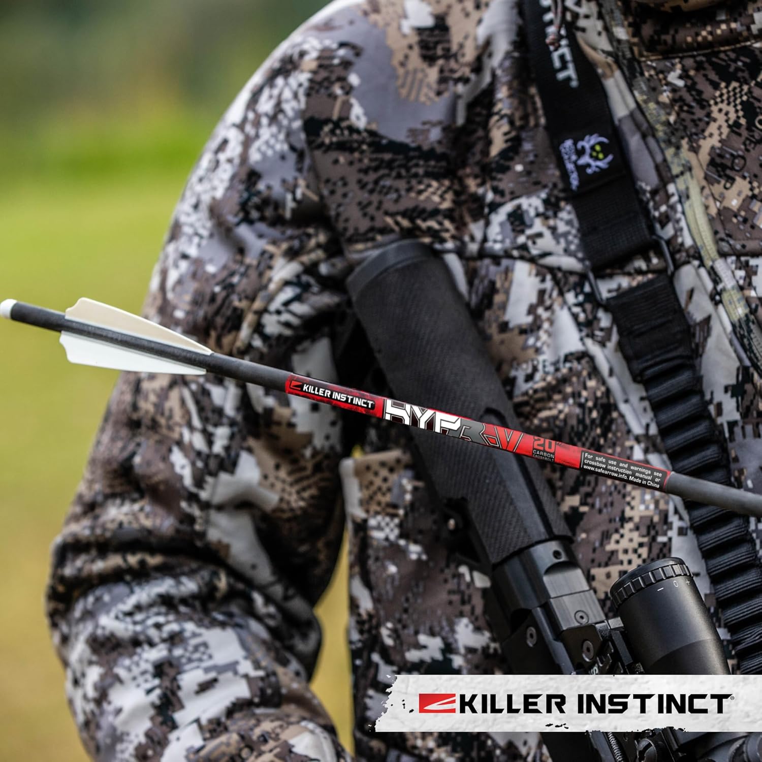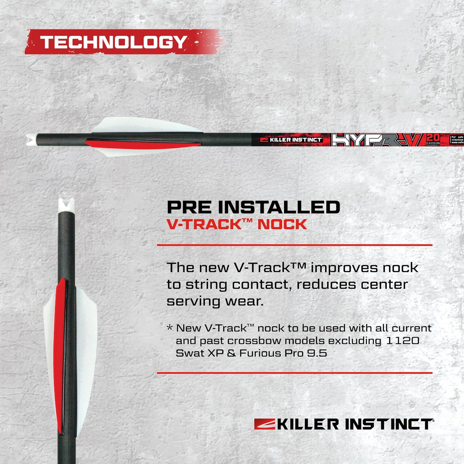 These HYPR-V 20" Crossbow Bolts feature the new V-Track nock system for ultimate accuracy. Each bolt weighs 390 grains total with a 100-grain point. Built with .003" straightness tolerance, .300" inner diameter, and .346" outer diameter for precision performance. V-Track nock improves string contact and reduces center serving wear. Works with all Killer Instinct crossbow models that use normal half-moon nocks. Improved accuracy with narrow axle-to-axle crossbows. Grain weight tolerance is +/- 1.0 for consistent results. Available in 6-pack or 3-pack lighted versions. Comes standard with all 2025 Killer Instinct crossbow models.