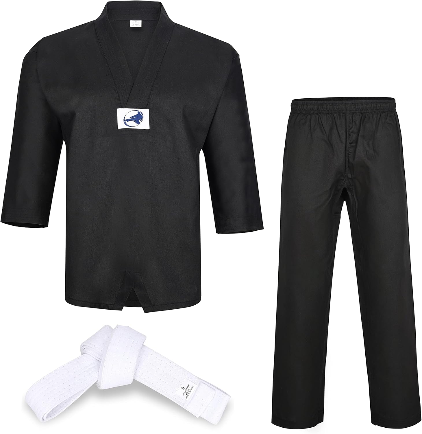 Special designed TKD uniform Fabric used for this uniform 8 oz per square meter Ribbed fabric with a blend of 55:45 cotton polyester..Jacket V is made with Black fabric Reinforced, double stitched flat seams are extra feature of this uniform..🎯 Full cut design provides extra room for training and competition Specially designed to supports your quick moves Perfect choice for higher level players.🏆 Uniform only contains a Black V neck White jacket and Pant with elastic drawstring waistband