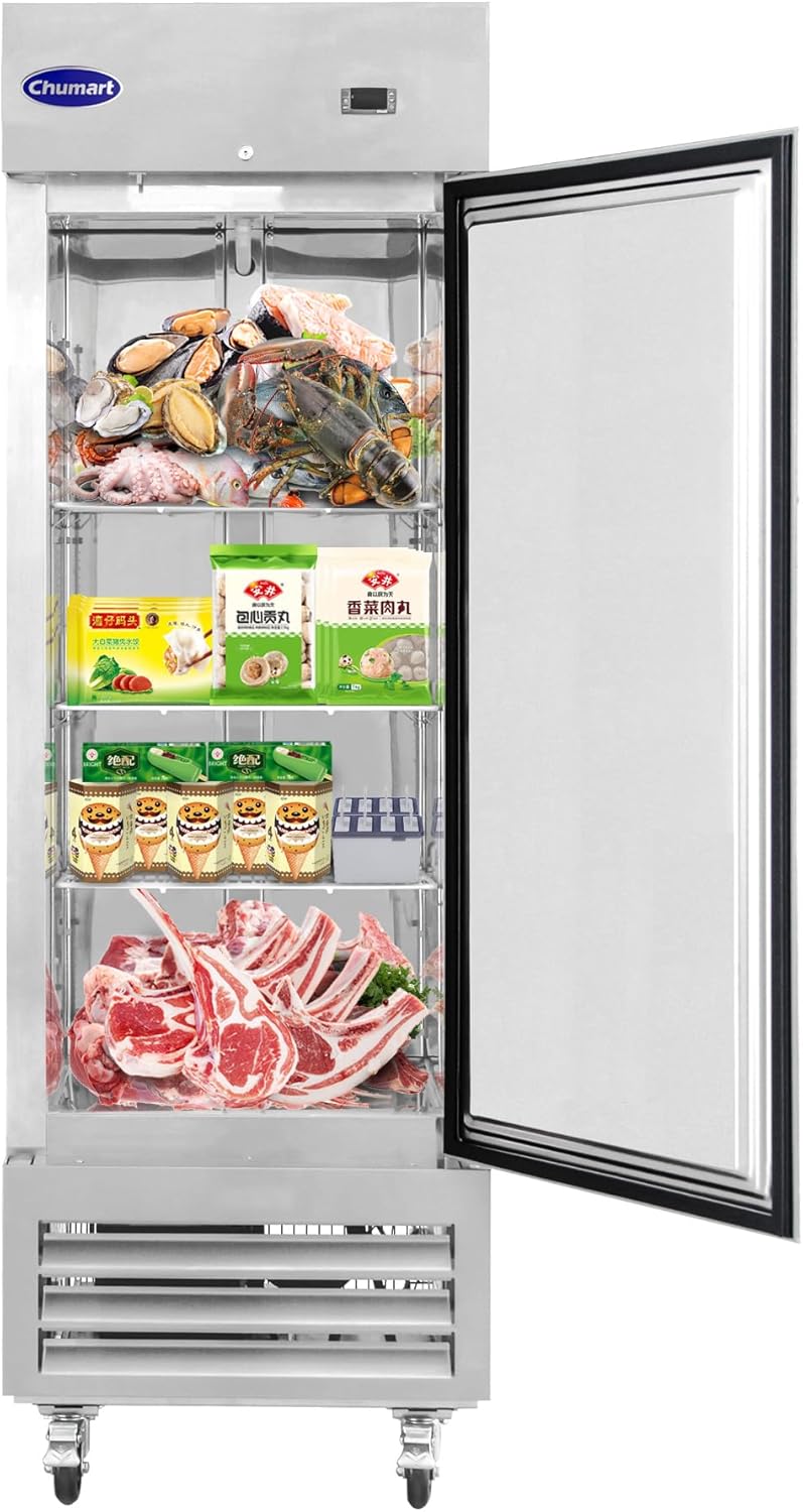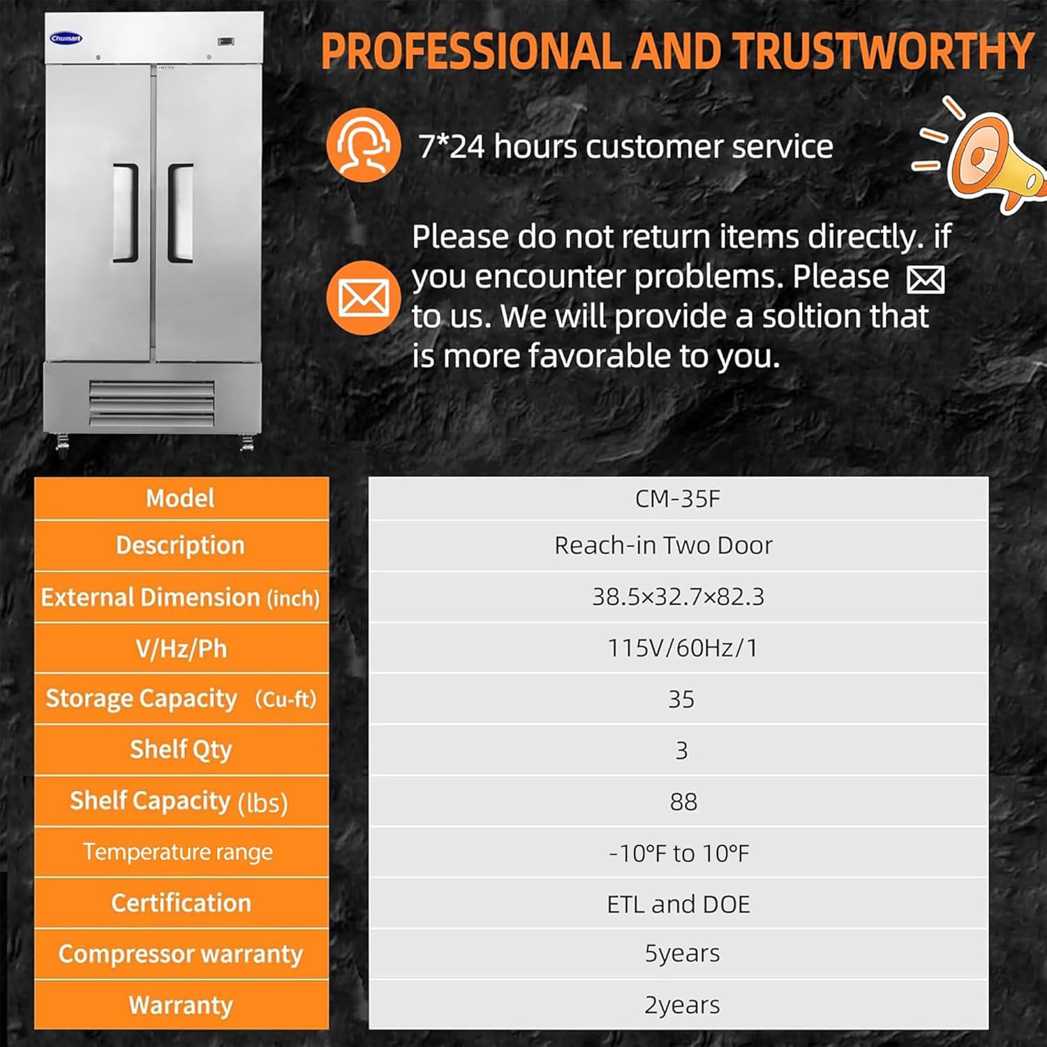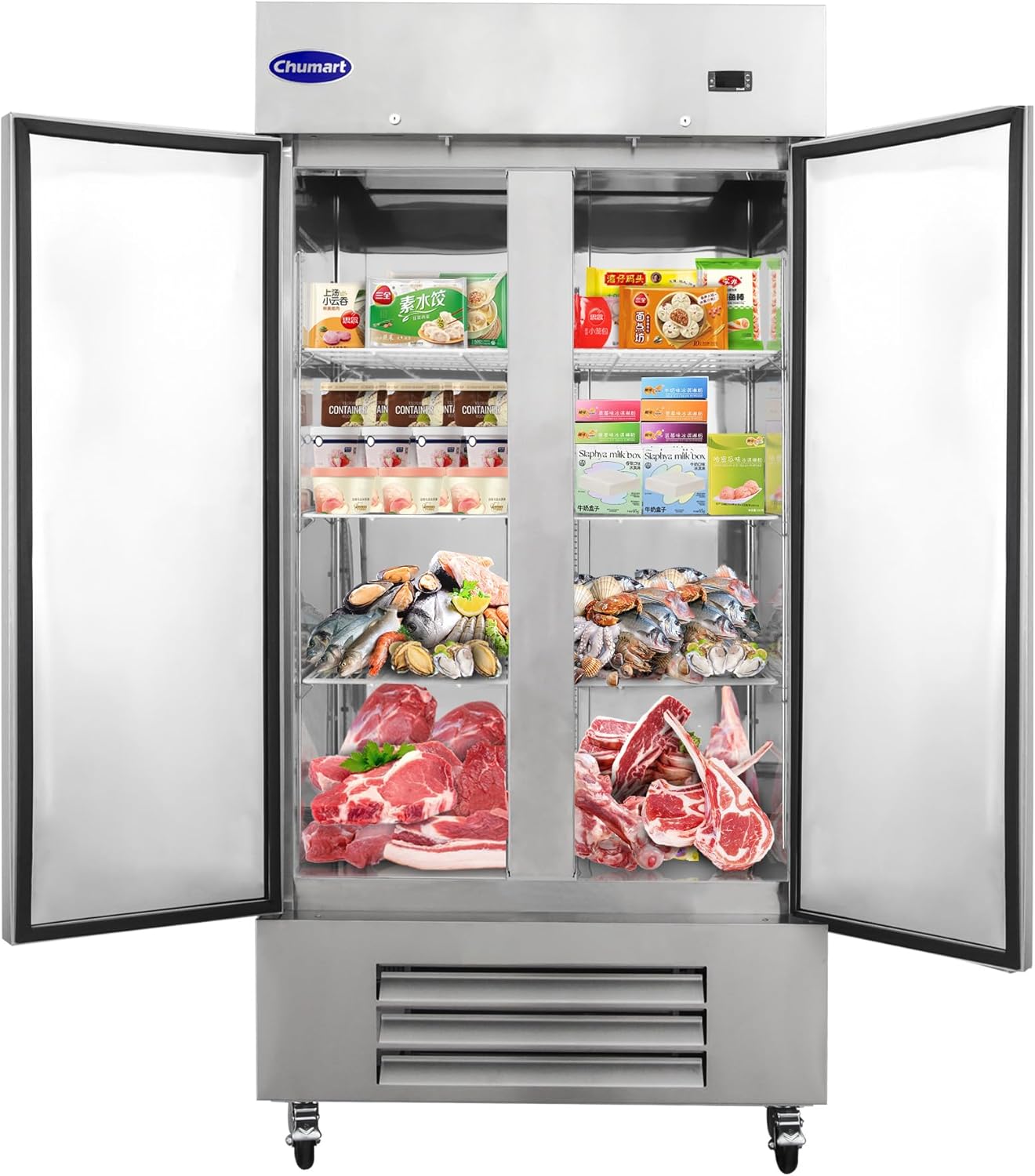 CHUMART 2 door commercial freezer 38.5 "W x 32.7" D x 82.3 "H, 35 Cu.ft Large capacity. Heavy duty S/S430 stainless steel construction both exterior and interior, durable and easy to clean. Our commercial freezer feature high performance compressors from Embraco and powerful fan cooling systems It can quickly and evenly distribute cold air throughout the freezer , allowing seafood, meat and other ingredients to be stored for a long time and maintain their taste.2 door freezer with 6 shelves, each holding 100 pounds. The bottom-mounted compressor and 90°automatic door closing mechanism better maintain the temperature inside the freezer, designed for everyday use in busy commercial Spaces. Two-door commercial freezers have 4 heavy-duty casters and 2 with brakes on the front provide excellent performance when moving and stabilizing. The freezer is ETL certified and Energy DOE certified, with a 5 year warranty on the compressor and a 2 year warranty on all parts, for added peace of mind when using it.Upright commercial fridge are the ideal partner for your restaurant or other catering business