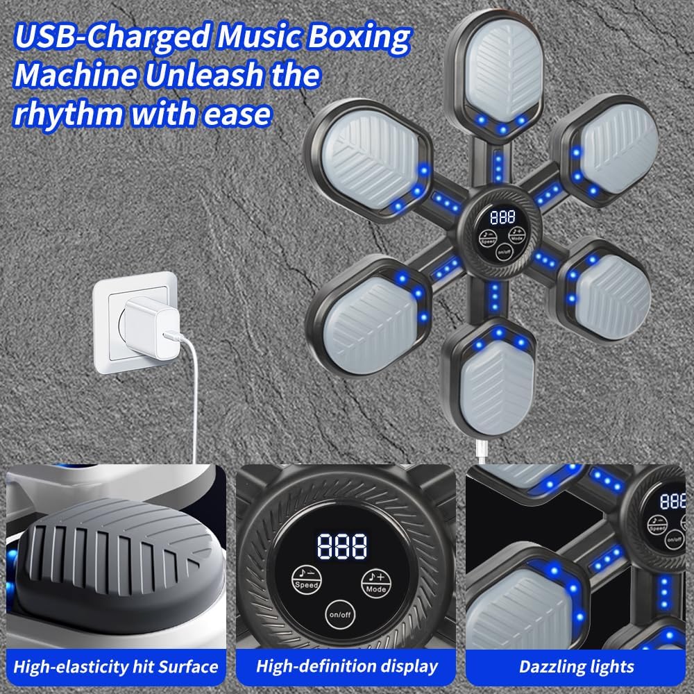 Experience the ultimate in home fitness and entertainment with the CloudHand Smart Music Boxing Machine. This innovative punching machine is designed to elevate your workout sessions with enhanced audiovisual features and seamless Bluetooth connectivity. The machine comes with improved speakers and dynamic LED lighting that activates when you hit the targets, providing real-time feedback on your reflexes and coordination. You can easily switch between your favorite music tracks, creating an engaging and motivating exercise environment.Crafted from high-elastic foam, the impact surface offers excellent rebound and shock absorption, ensuring your hands are protected during intense training. The stylish and smooth surface is also easy to clean, maintaining its appearance over time.With nine distinct modes and various speed settings, this smart music boxing machine is versatile enough to cater to a wide range of users, from beginners to professionals. It’s perfect for family activities, allowing children to practice boxing, enhance their reflexes, and enjoy a fun workout.The convenient height adjustment feature makes it suitable for both adults and kids, and the included pair of gloves provides additional hand protection. The wall-mounted design saves space and installation time, making it easy to set up a home boxing gym without the need for a dedicated space. Exercise at home with the CloudHand Smart Music Boxing Machine and enjoy the benefits of a full-body workout while saving time and money. Make fitness and fun a part of your daily routine with this innovative and versatile boxing equipment.