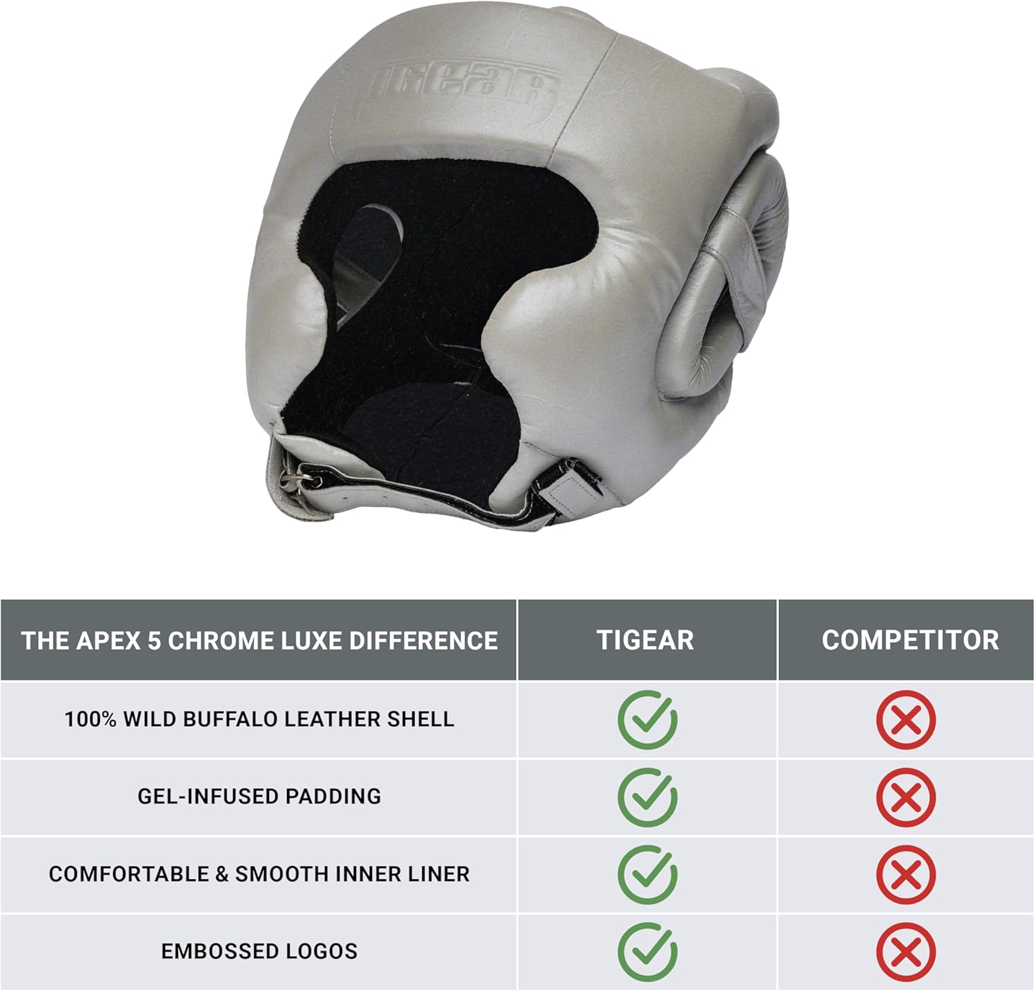 The Tigear APEX5 Pro Headgear – Chrome Luxe reflects the highest standard of craftsmanship in full-contact training gear. Wrapped in 100% Buffalo leather, the exterior delivers lasting durability with a polished, high-gloss finish that defines the Chrome Luxe series. Gel-infused padding offers a responsive, contoured fit that stays comfortable through movement. Inside, the ultra-soft liner provides a smooth, stable feel during extended sessions. Finished with precision embossing and minimalistic detailing, this headgear combines elevated design with performance-driven construction—built for athletes who expect excellence in every round.