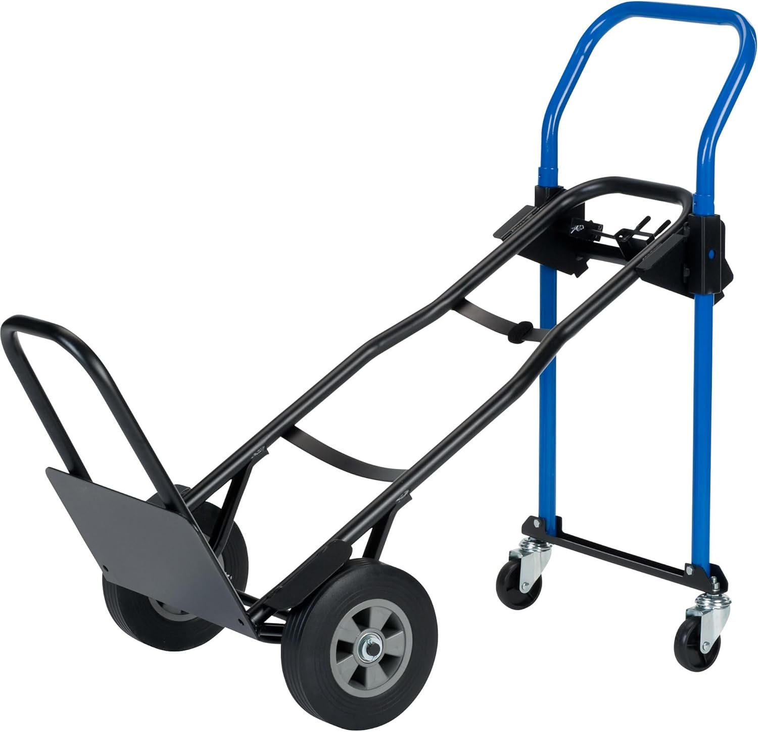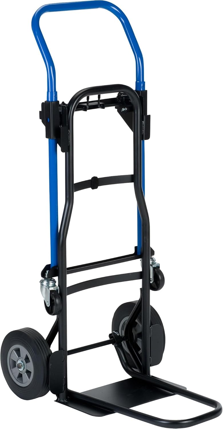 Made in the USA. The Harper Quick Change 3 position lightweight steel convertible dolly and cart is the only personal assistant you need for all your home, work or office moving needs. Harper’s exclusive easy-to-use Quick Change mechanism converts truck positions in seconds - no tools or pins required! High strength steel 44’ tall frame accommodates loads up to 500 pounds. Four wheel incline assist mode for even weight distribution and better load control in tight spaces. Four wheel cart design makes simple work of large, heavy and oversized loads. Large solid rubber 8" flat free wheels and 3" swivel casters for easy maneuverability. Folding nose extension provides additional truck capacity, easily folds out of the way when not being used. The Harper Quick Change 3-in-1 convertible hand truck is large enough for most moving jobs and its compact size stores easily in a closet or auto trunk.