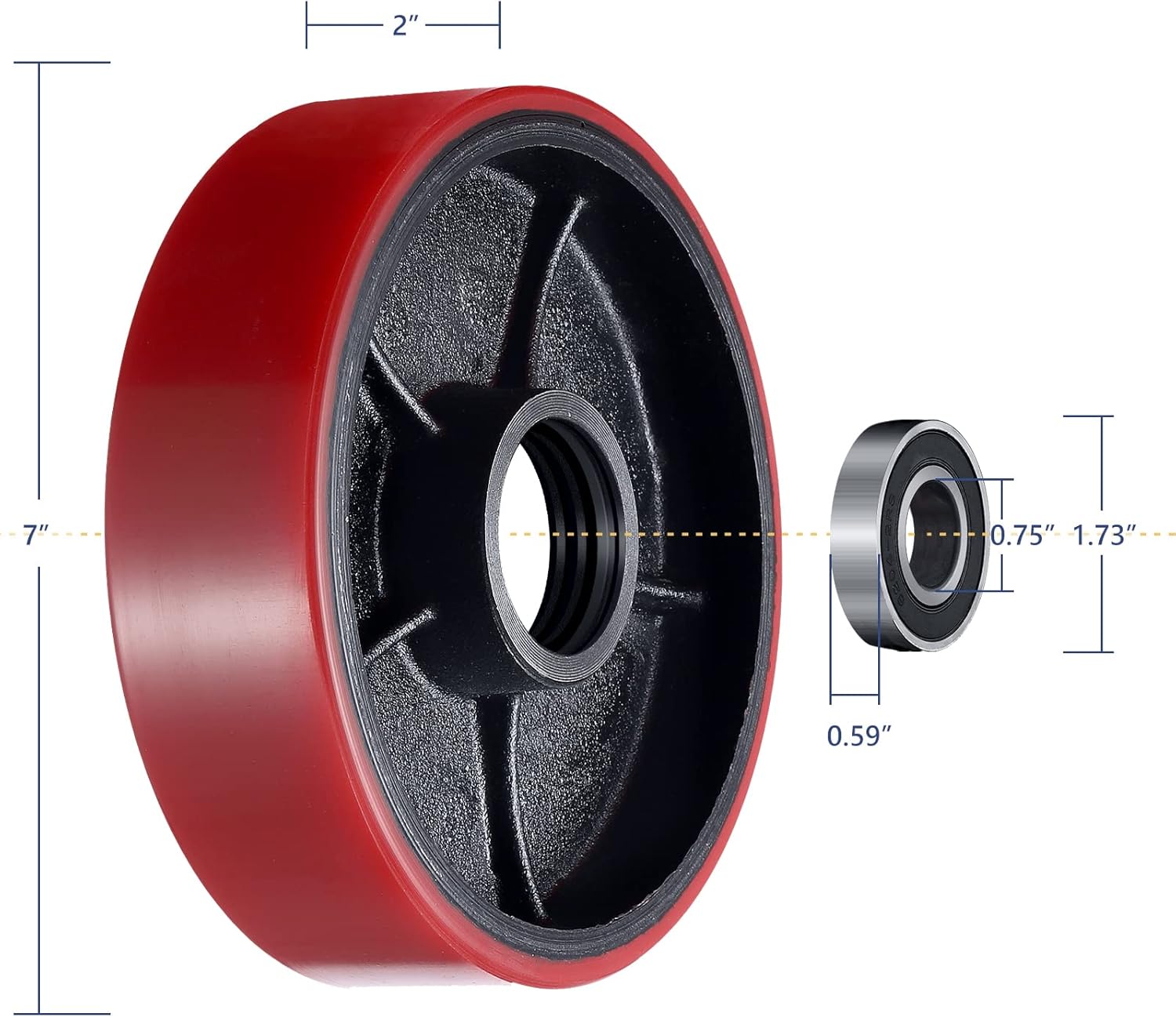 Heavy-duty Pallet Truck Replacement Wheels designed for replacement on most standard pallet trucks 7"x2" sizing also may allow for use on other compatible pallet trucks . Wheel dimensions: diameter: 7”, hub length: 2", hub id: 20mm Bearings are trade number 6204| i.D. 20 mm, O.D. 47 mm Includes (qty.): A pair / 2 Pcs Product Type: Rear replacement wheels, Material Type: Polyurethane