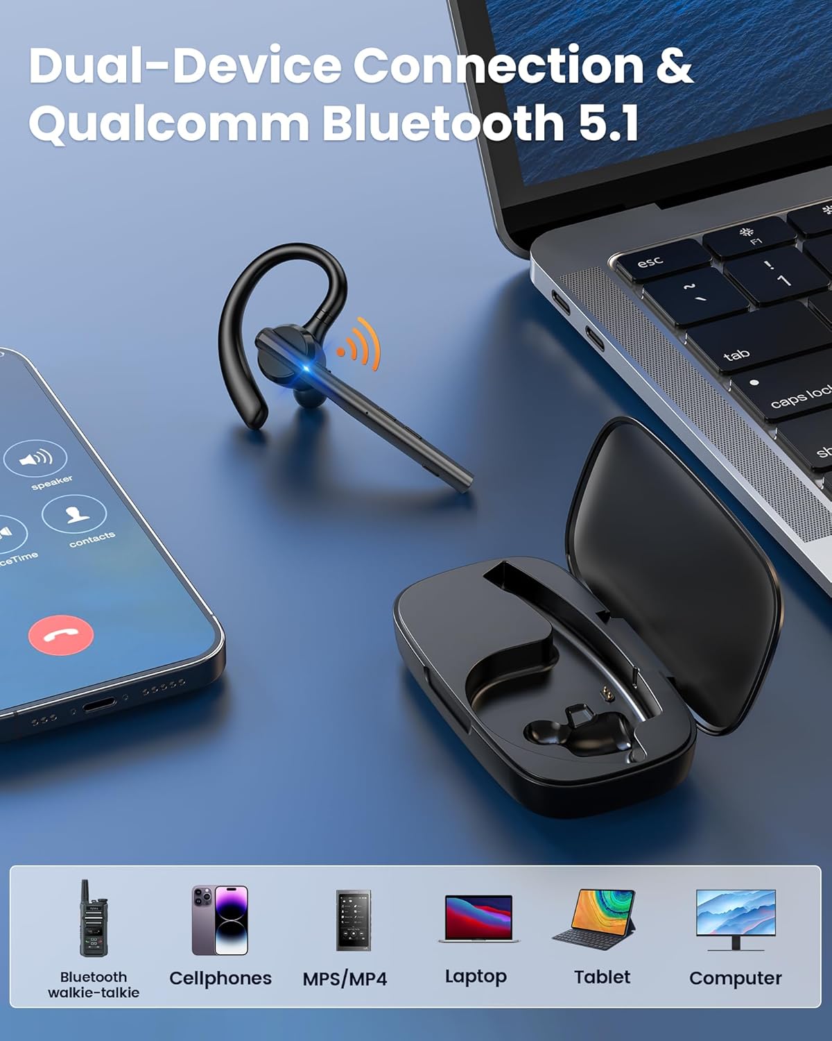 • Bluetooth 5.1 and Wide Compatibility: New bee handsfree bluetooth headset powered by the Qualcomm QCC3020 Bluetooth 5.1 chip to maintain 15m range connectivity with two devices quickly and stably. Support Dual pairing lets you instantly switch between Laptop and Smartphone without interruptions. The bluetooth phone earpiece with microphone is compatible with most bluetooth devices such as iOS or Android Phone/ Computer/ PC/ Laptops and so on.(Note:The headset do not support answering calls from any office meeting or social apps. - They support answering calls from phone numbers.)