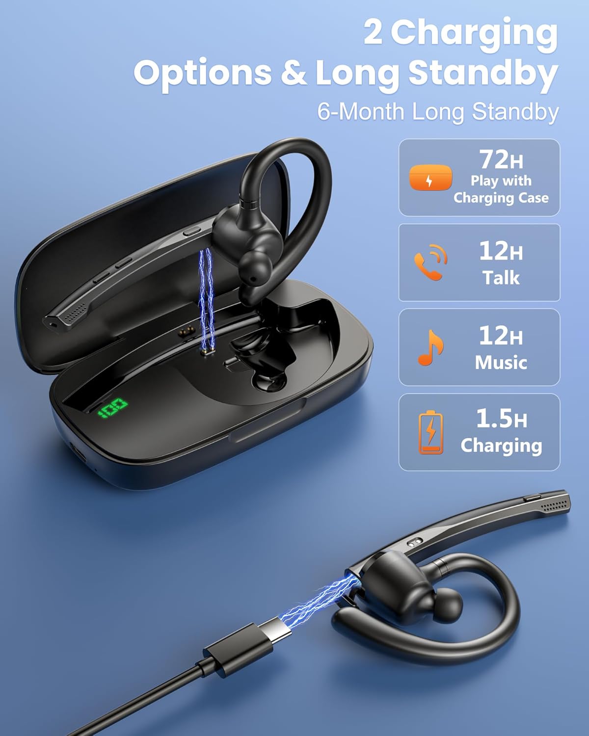 • ENC Dual-Mic Noise Reduction: The bluetooth earpiece features ENC dual-mic with CVC8.0 noise reduction. The main mic is lengthened to accurately collect call sounds. The secondary mic collects ambient noise and enhances call quality through noise reduction processing of the main control chip. Besides, CVC8.0 can effectively further filter out background noise. Together, they can cut up to 90% of background noise, ensuring your voice is heard clearly.
