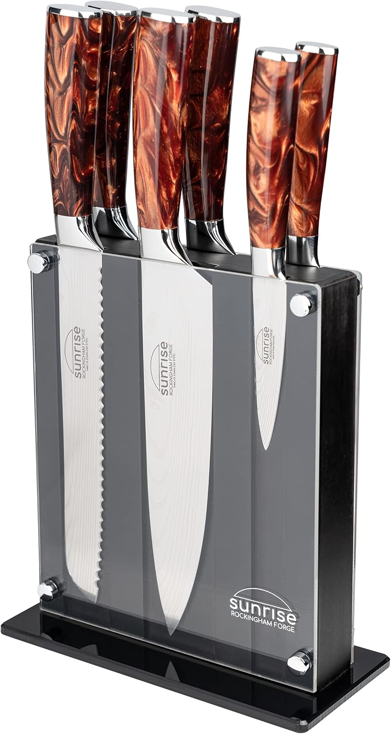 Forge the Sunrise Collection. This range is designed to symbolise hope and new beginnings, and features three vibrant colours which will spread joy to your kitchen knife collection: Amber, Sapphire and Emerald. The 3-Piece Knife Set contains a selection of essential kitchen knives, which will cover most of your food preparation needs, all in a stylish gift-style box. Treat your friends and family to a 8” Chef’s Knife, 8” Bread Knife, and 3.5” Paring/ Peeling knife, all in one handy, stylish set!