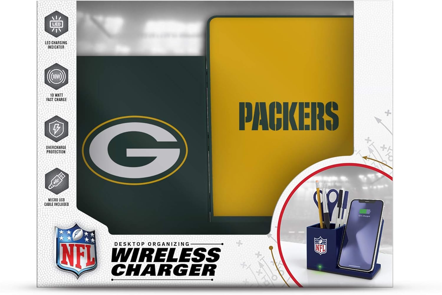 The Perfect Desktop Accessory for the Ultimate Fan! Keep your Desk Tidy and your phone charged with the PRIME BRANDS GROUP Wireless Charging Desktop Organizer. Perfect for Home or Office Use. This is no ordinary pen holder. With 10W of Wireless Charging Power & Official NFL Team Colors & Logos It wont be long before your co-workers start asking you where they can get theirs! Includes 1 Year Manufacturer Warranty.
