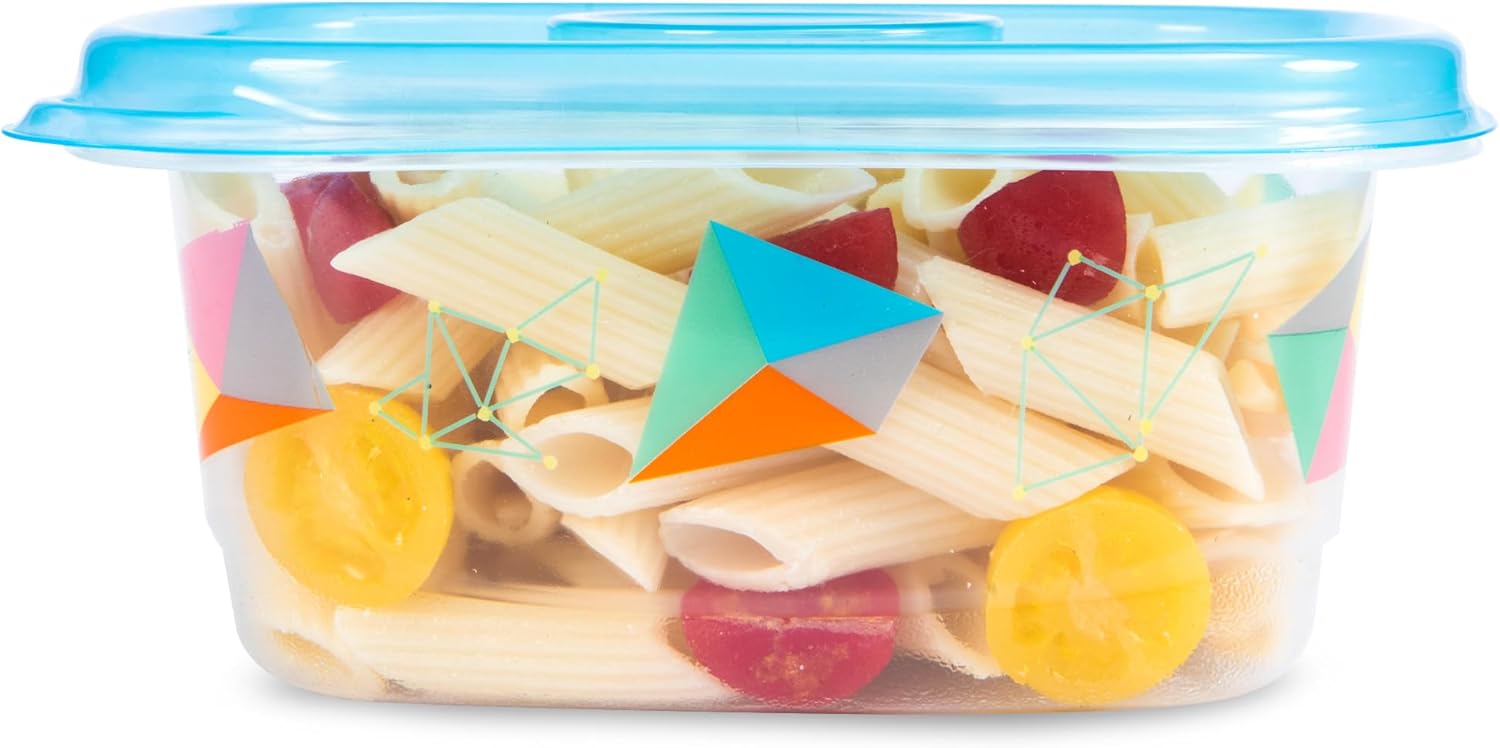 Glad GladWare Design Series Food Storage Containers are medium rectangle containers holding 24 ounces, designed with patterned lids that distinguish the Design Series from standard GladWare. Each container is well-suited for salads, pasta, rice dishes, and other lunch-sized portions that need reliable storage from home to destination. These containers work best for people packing daily work or school lunches, meal preppers building structured weekly menus, and anyone who wants a more distinctive-looking container among standard food storage options. The 24 oz size fits standard lunch bags and insulated totes. Snap the lid firmly until it clicks into position before placing in a bag. Vent one corner before microwaving to release steam. Containers are top rack dishwasher safe for easy daily cleanup. Lids interlock to stay organized in kitchen drawers and cabinets.