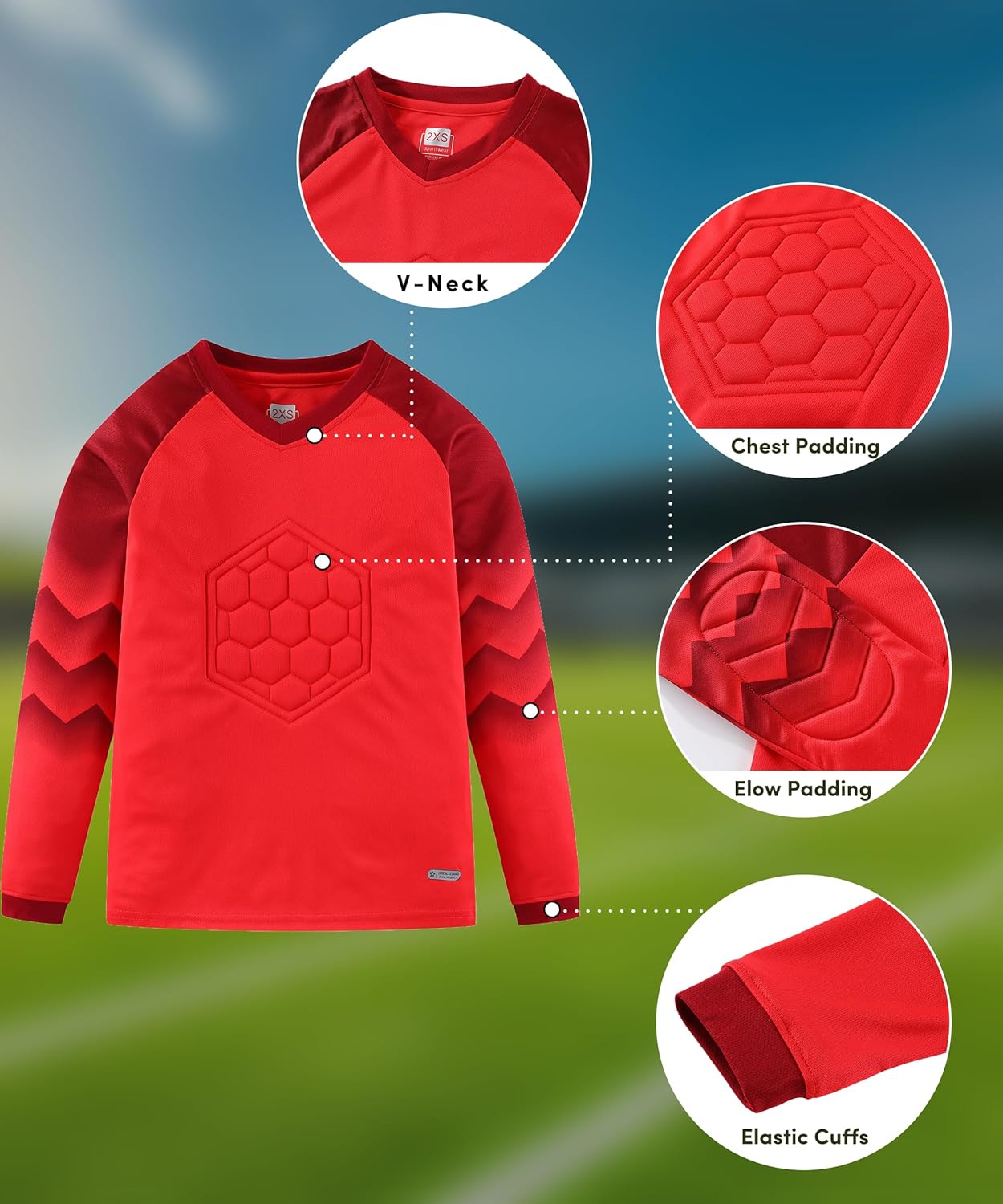 • Extra padding for safety, foam pads on knees, hips, and elbows protect kids during games or practice