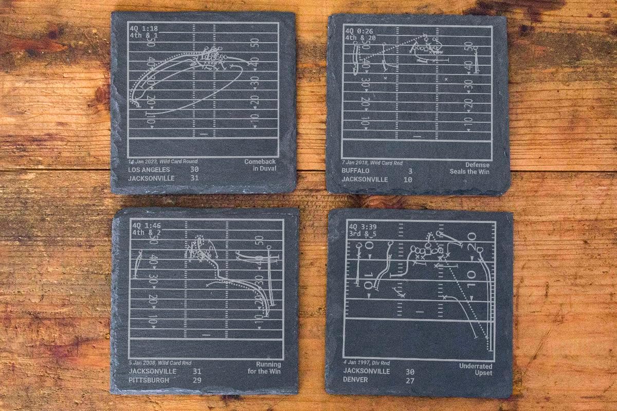 Four Distinct Plays From Jaguars History Relive four of the greatest moments in pro football history. Each set comes with four laser-etched coasters depicting iconic moments and plays that every fan remembers The Perfect Gift 16,000+ Five Stars across all selling platformsOur coaster sets are adored by sports lovers. A unique Jaguars gift idea for men - your dad, son, friend, father's day, christmas, or any sports fan in your life! Something Different Extremely unique, our coaster set brings something new and asethtic. Not the same-old logo slapped onto a product, our coasters showcase memories that real fans immediately recognize as they begin telling stories about their favorite moments. These slate coasters are made from 100% real natural slate and laser-etched to maintain durability, prevent flakey paint like other coasters, and bring a clean and aesthetic look to any room or office in your house. A great home decor option for you or your loved one. These leatherette coasters are laser etched to reveal a vibrant silver foil. Size: 4'' x 4'' x 0.15'' per coaster Weight: 0.2lbs (3oz) Stitched border Notice: No sports player, team, league, or playoff is affiliated with Playbook Products or is the source of, is responsible for, or has endorsed, sponsored, or authorized these products or this website.