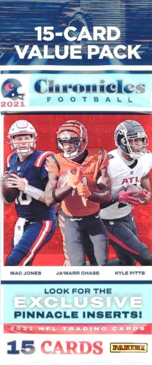 Each box (sold unwrapped by Panini) contains 12 packs of 15 cards. *Look for exclusive Pinnacle inserts. *Showcasing many different NFL card brands, the 2021 Panini Chronicles Football offers new cards for the 2021 Rookie Class and season. While most products stick with a main theme or style, Chronicles product is all about variety. *2021 Panini Chronicles Football features a 100-card Base Set featuring the brightest rookies and stars in today’s NFL. Also, look for these randomly inserted cards: Base Chronicles Bronze,, Pinnacle, Pinnacle parallels, Score Update Rookies Silver, Legacy Update Rookies Silver, Flux Rookies Silver, Dynagon Rookies Silver, Prizm Black/Silver, Panini Bronze, Gridiron Kings Bronze, Luminance Update Rookies Bronze, Signature Series (#'d to 399 or less), Turn of the Century Autographs (#'d to 199 or less), Clear Vision Rookies, Magnitude, and Playoff Momentum Rookies.