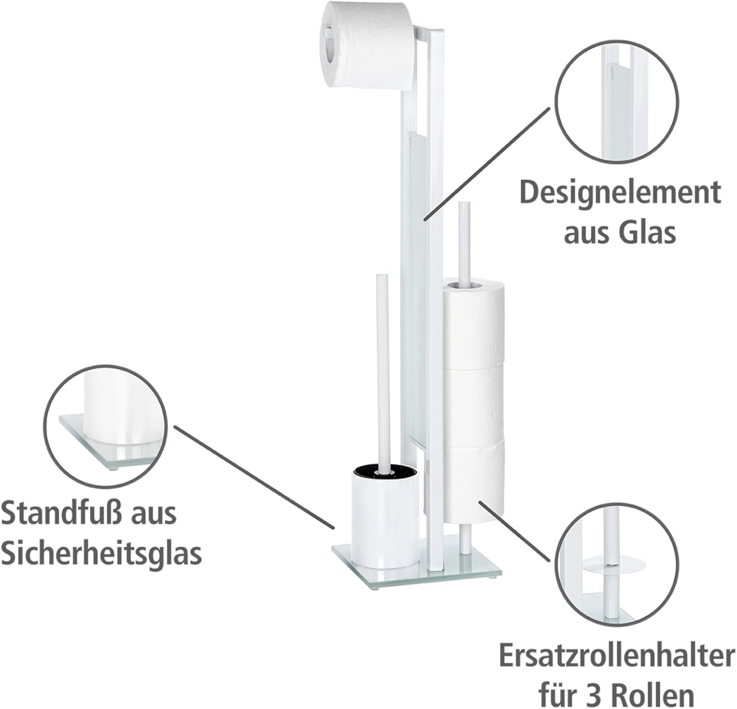 The free-standing steel WC brush set Rivalta sets decorative design accents in the bathroom. It is a practical 3 in 1 combination, consisting of an open WC brush holder, an open toilet roll holder for immediate use and a separate spare roll holder for the storage of up to three more rolls. The attractive white safety glass panel s the firm standing of the WC brush set. The set includes a WC brush with a replaceable brush head. Material: Rack: Steel, Bottom plate, Glass: Tempered glass, Inner bin: Polypropylene Color: Rack: White, Bottom plate, Glass: White, Inner bin: Black Dimensions L/H/W: 18 x 70 x 20 cm Net weight: 2019 g